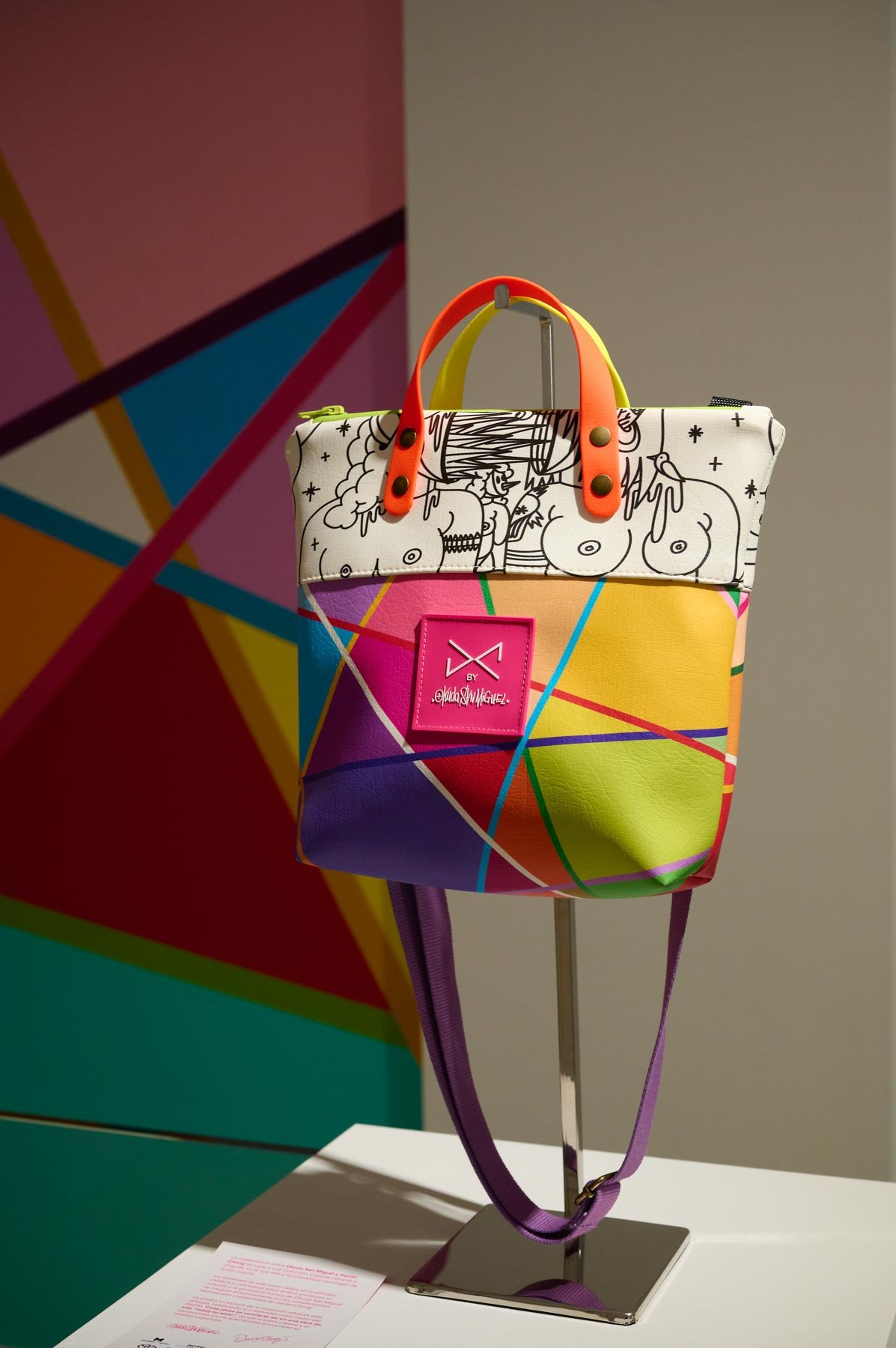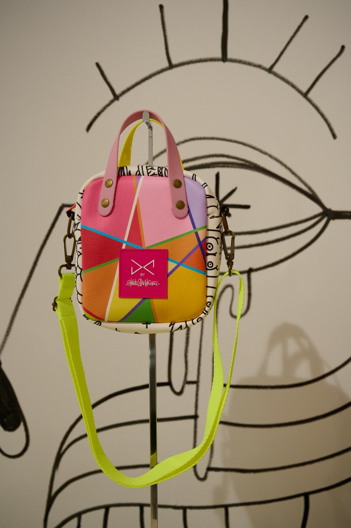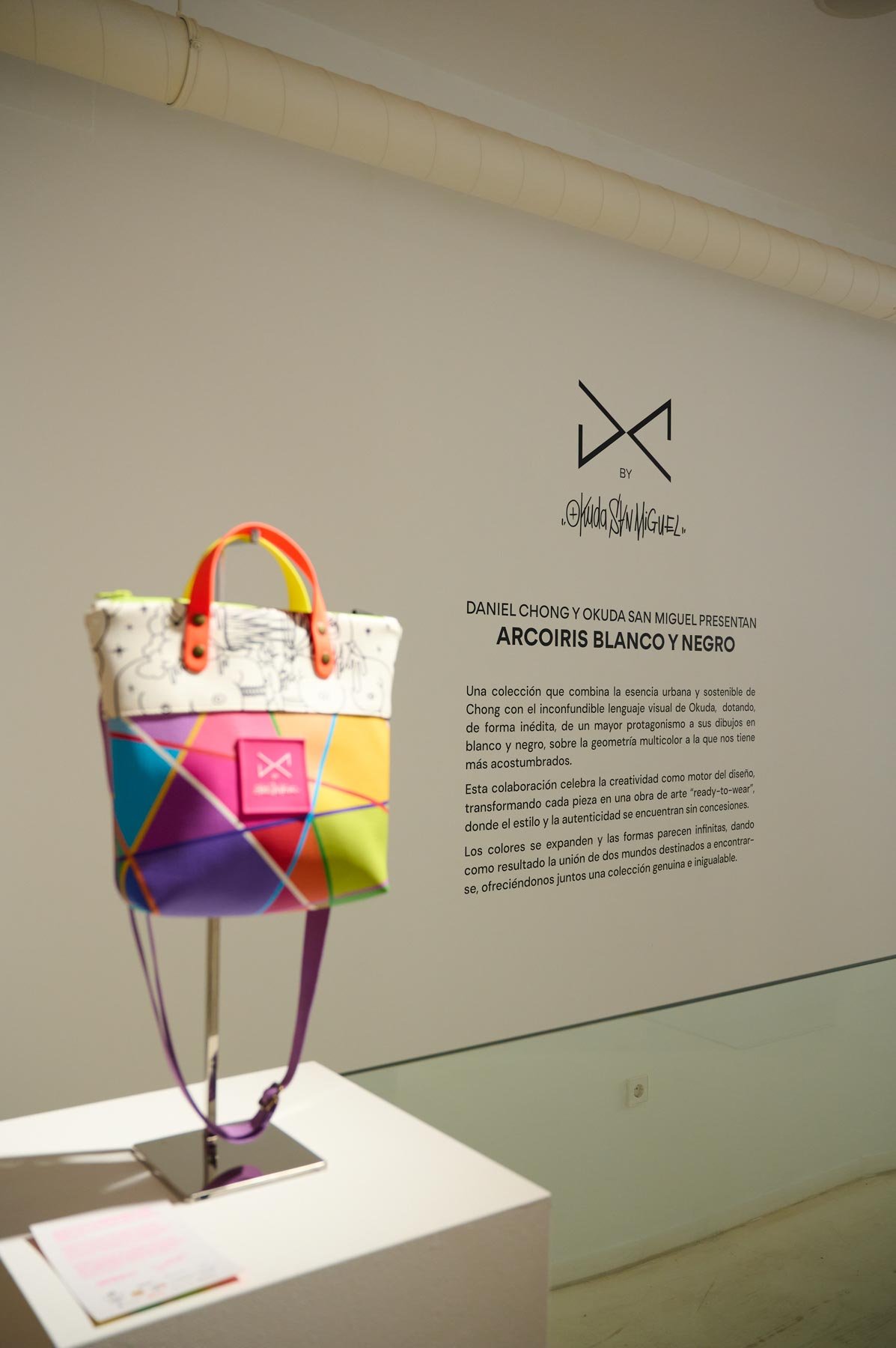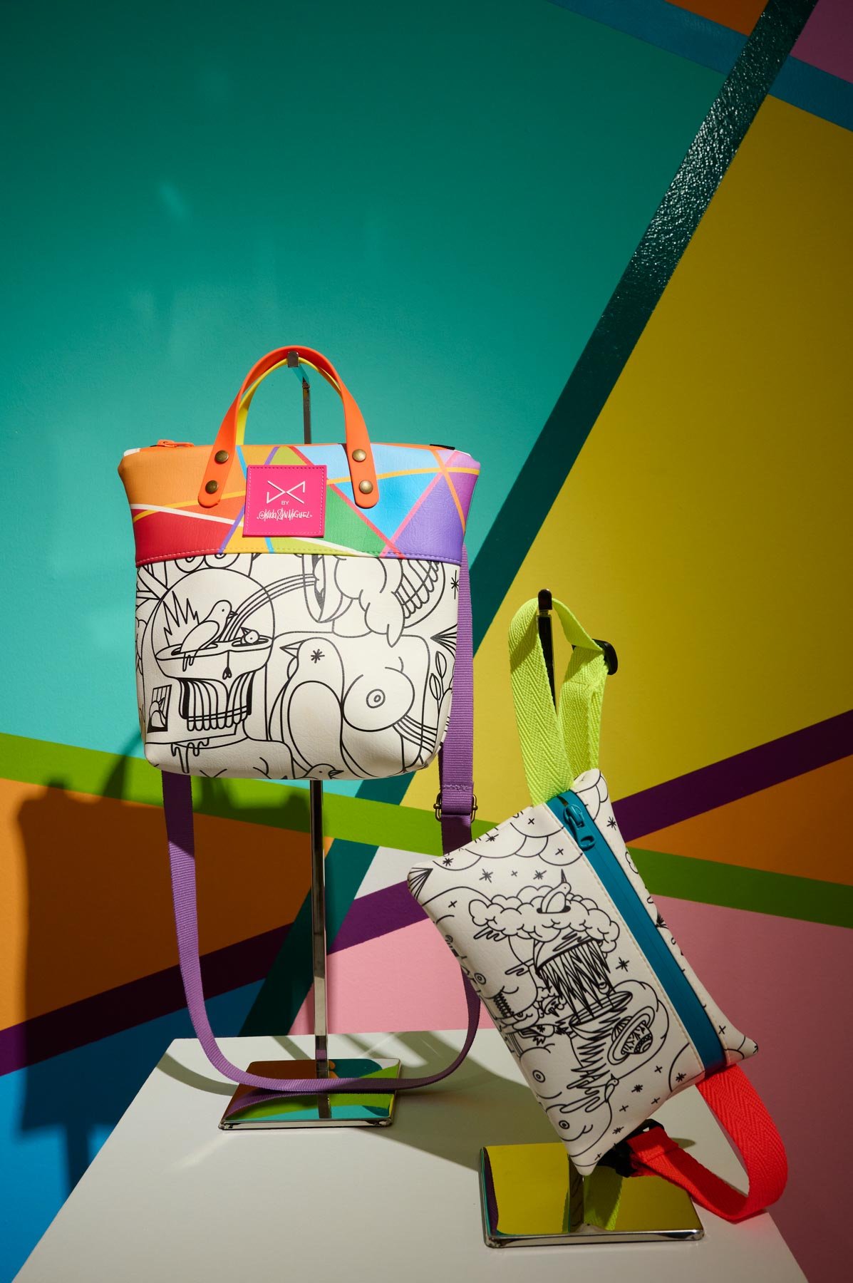 Una alianza que nace de la afinidad estética y conceptual entre ambos creadores: la paleta vibrante y las formas geométricas características de Okuda San Miguel se integran armónicamente en los complementos atemporales y funcionales de Daniel Chong. El resultado son piezas que trascienden su función, convirtiéndose en obras de arte ready-to-wear, donde el estilo urbano y la autenticidad se encuentran sin concesiones.