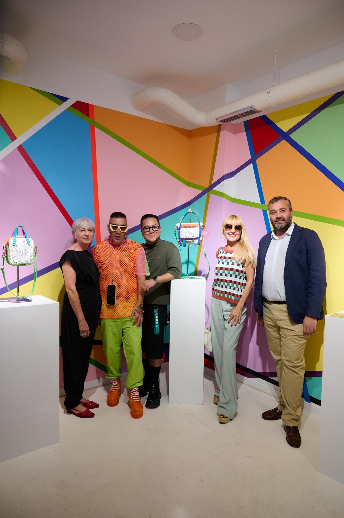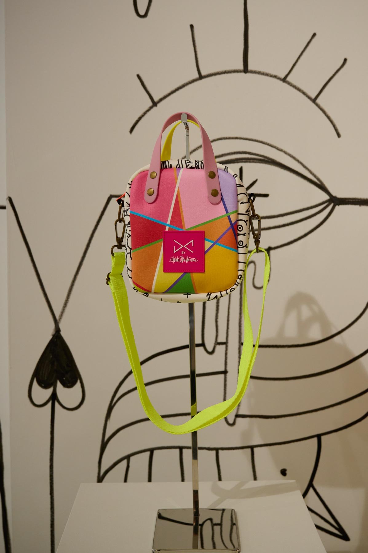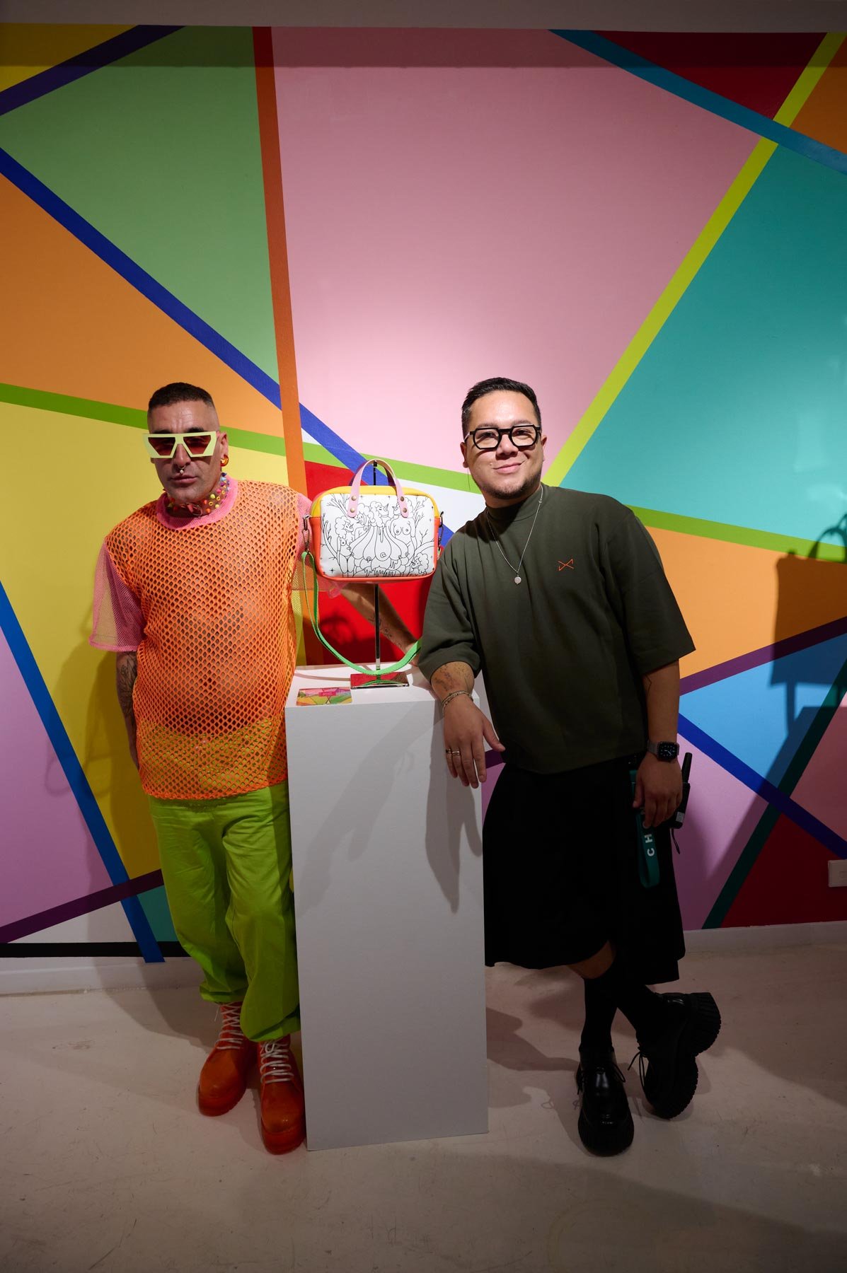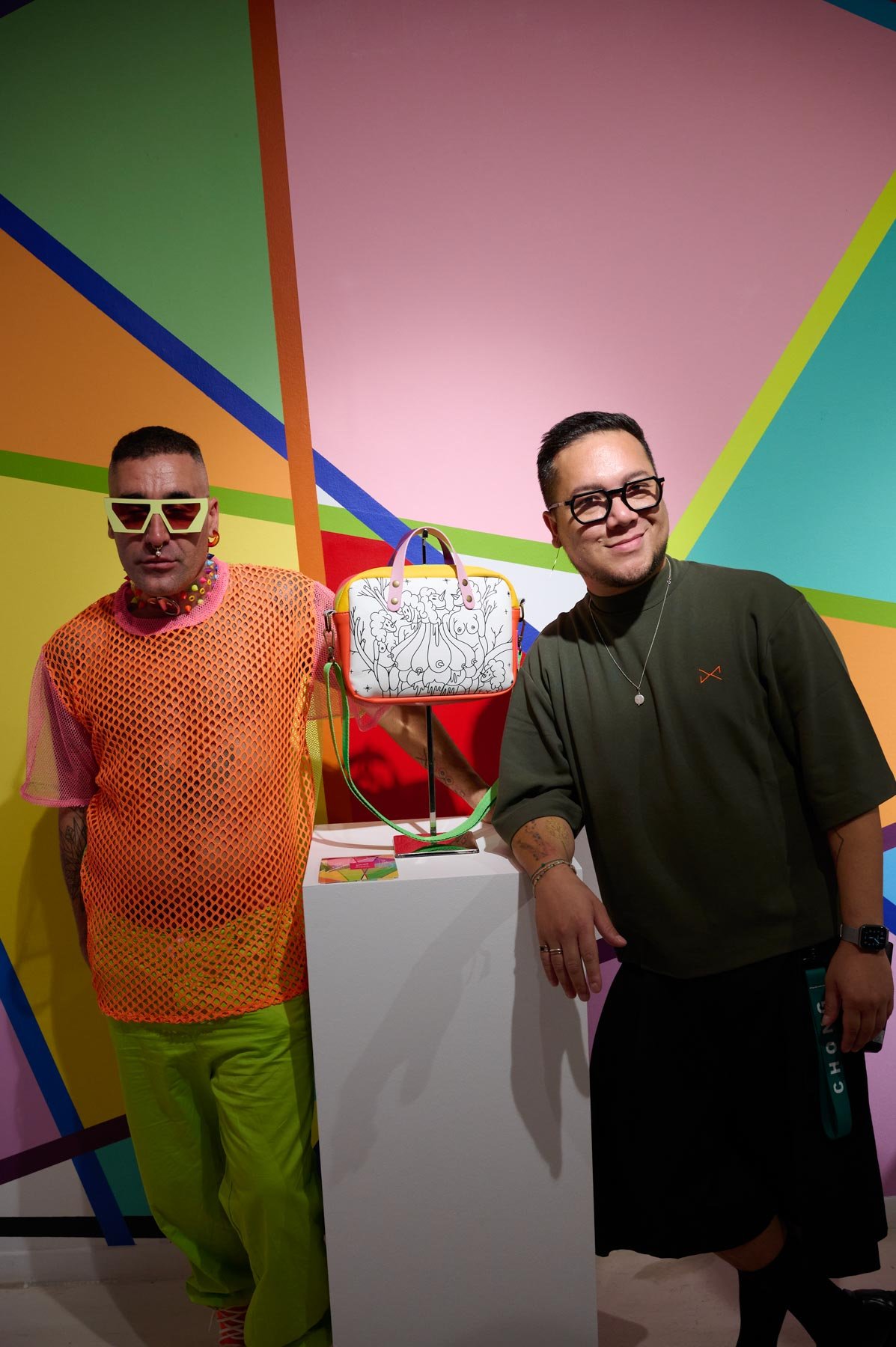 Una alianza que nace de la afinidad estética y conceptual entre ambos creadores: la paleta vibrante y las formas geométricas características de Okuda San Miguel se integran armónicamente en los complementos atemporales y funcionales de Daniel Chong. El resultado son piezas que trascienden su función, convirtiéndose en obras de arte ready-to-wear, donde el estilo urbano y la autenticidad se encuentran sin concesiones.