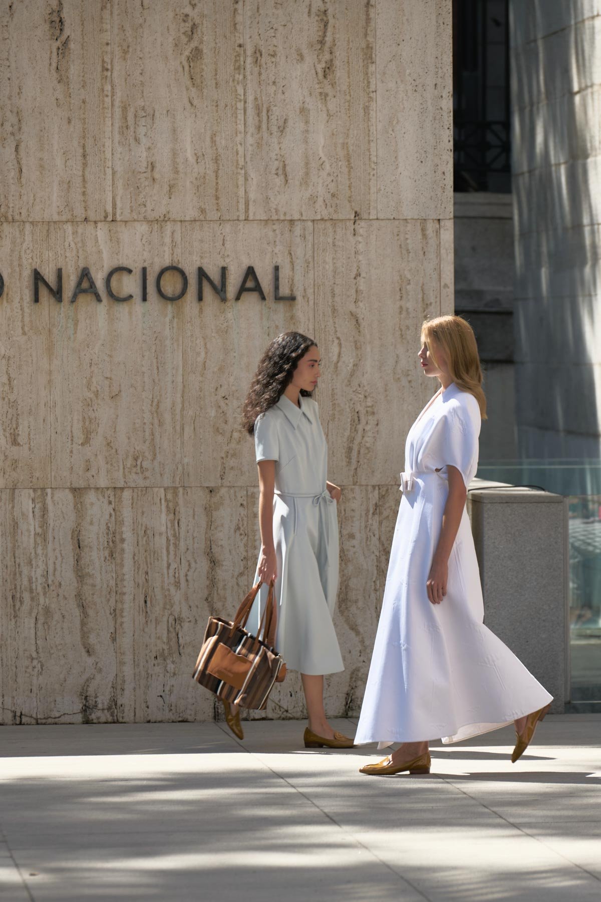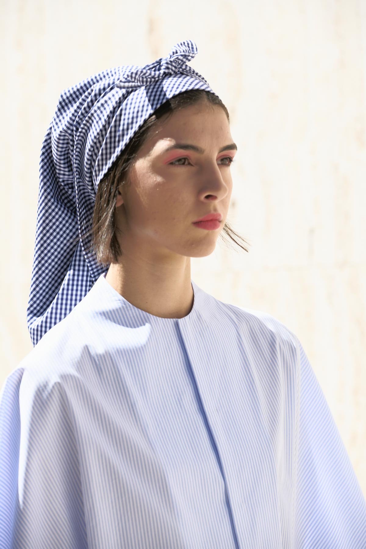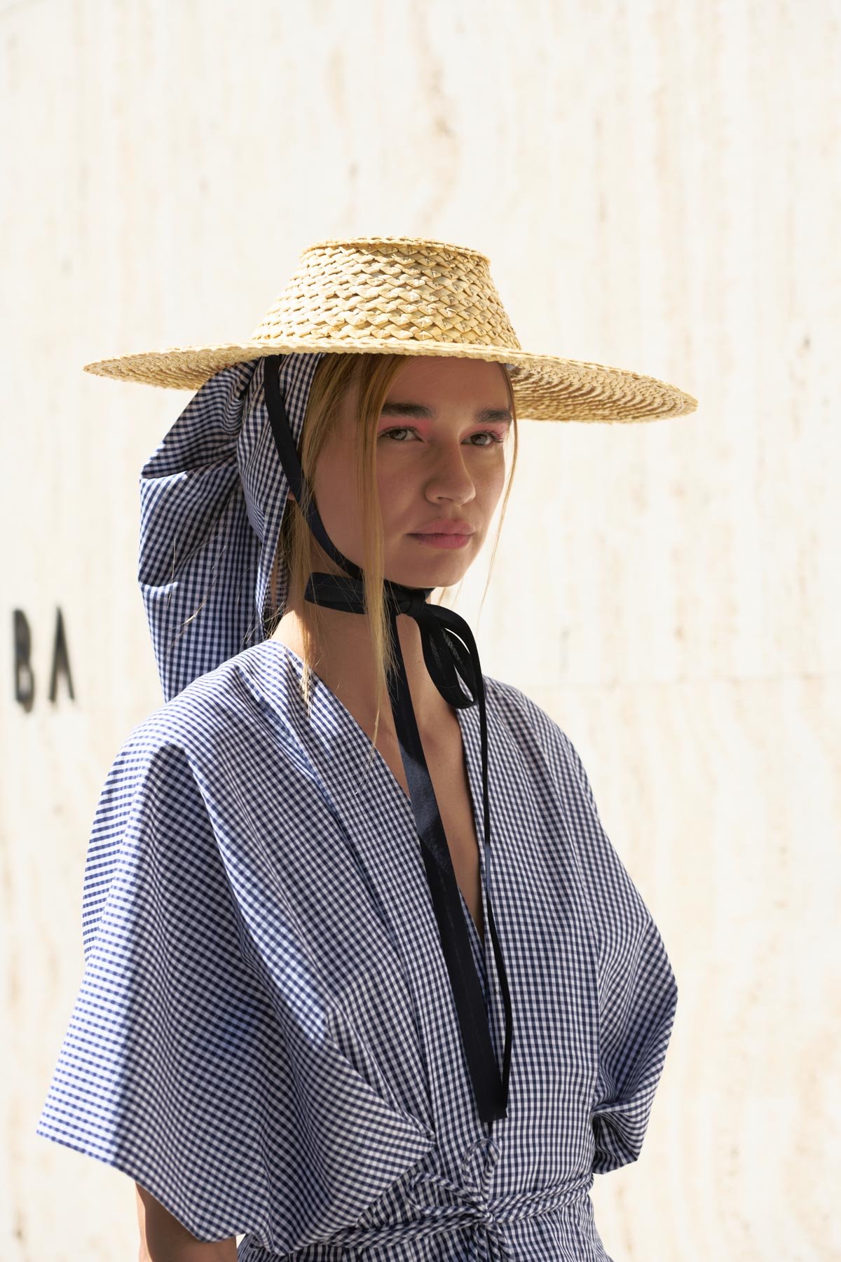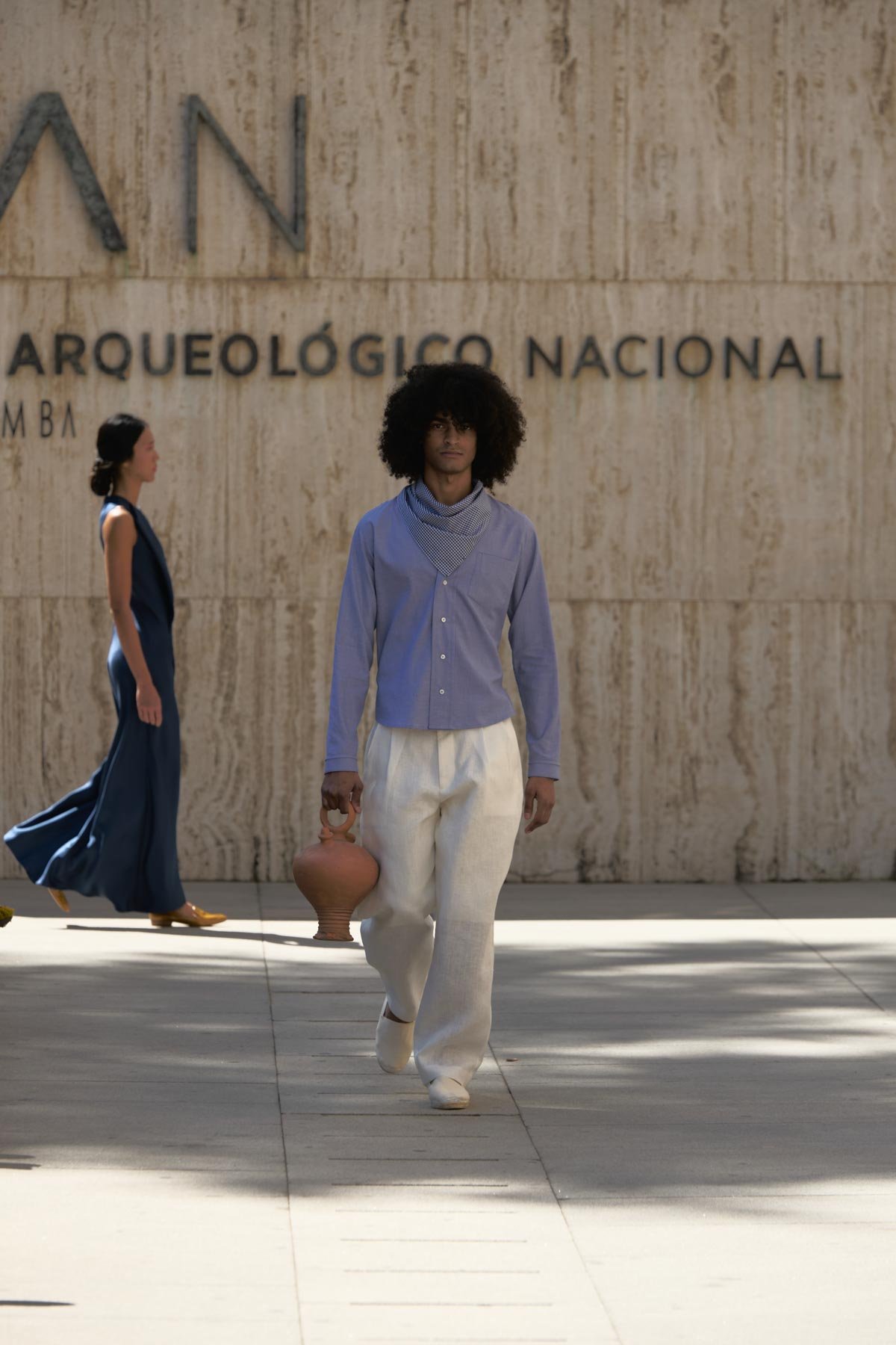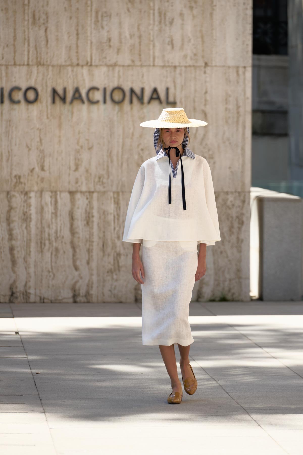 Los tejidos protagonistas de la colección son los algodones de cuadros vichy, suaves y ligeros, que contrastan con linos y sedas lisas en tonos monocolor. En la paleta de colores, el azul se impone como hilo conductor. Para completar la propuesta, la firma incluye sombreros Sancosmeiro hechos a mano con paja de centeno del Castillo de Vimianzo y mocasines de piel y bolsos firmados por Devota & Lomba.