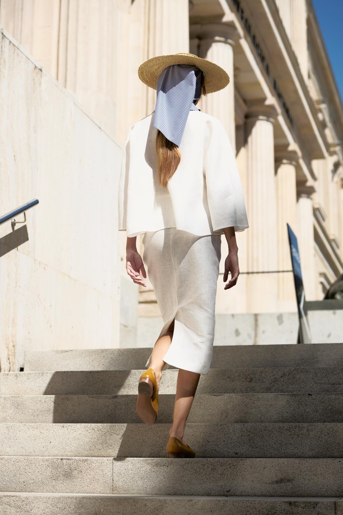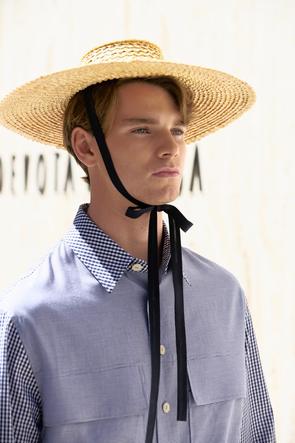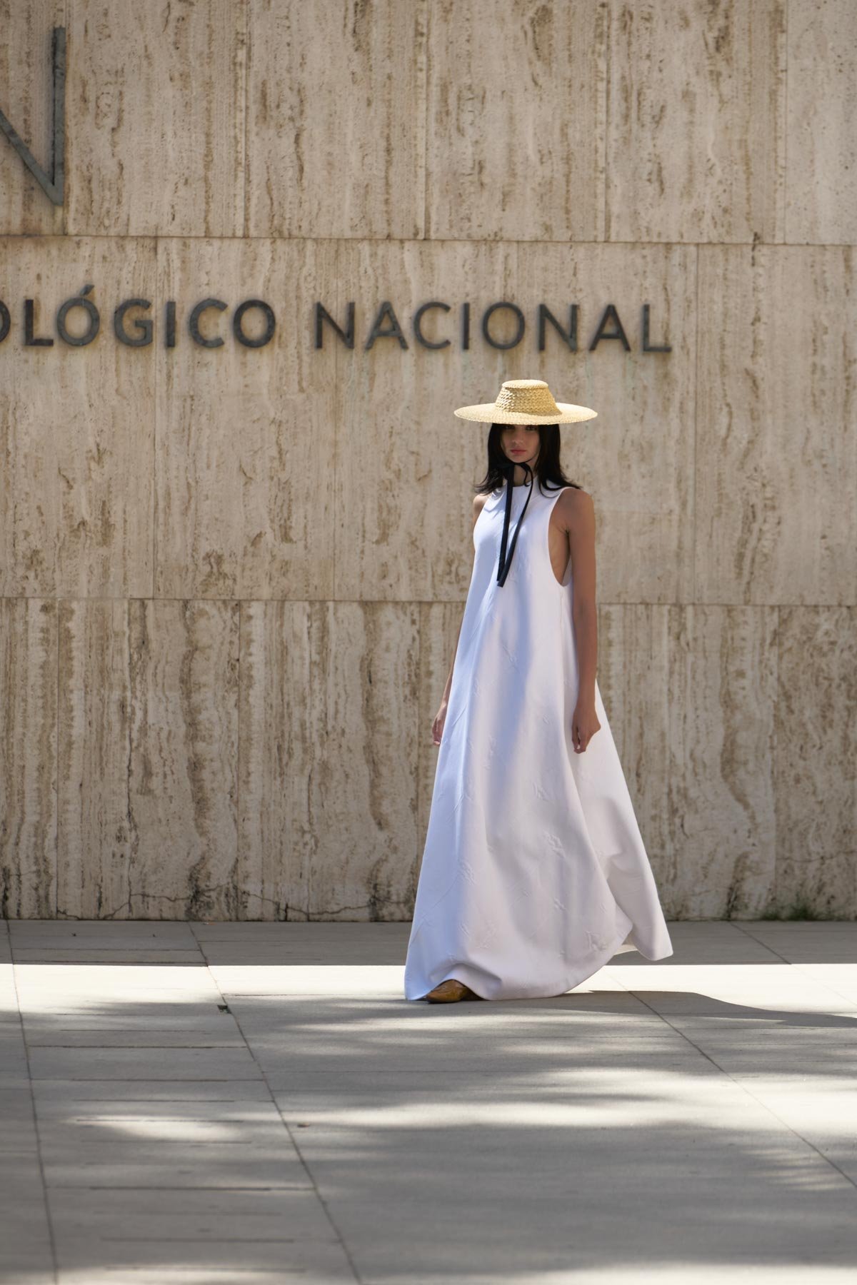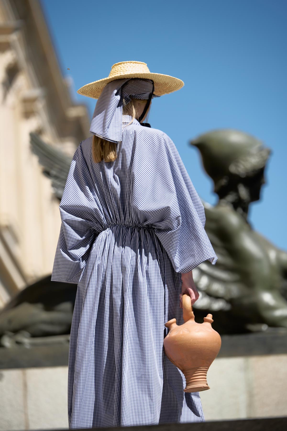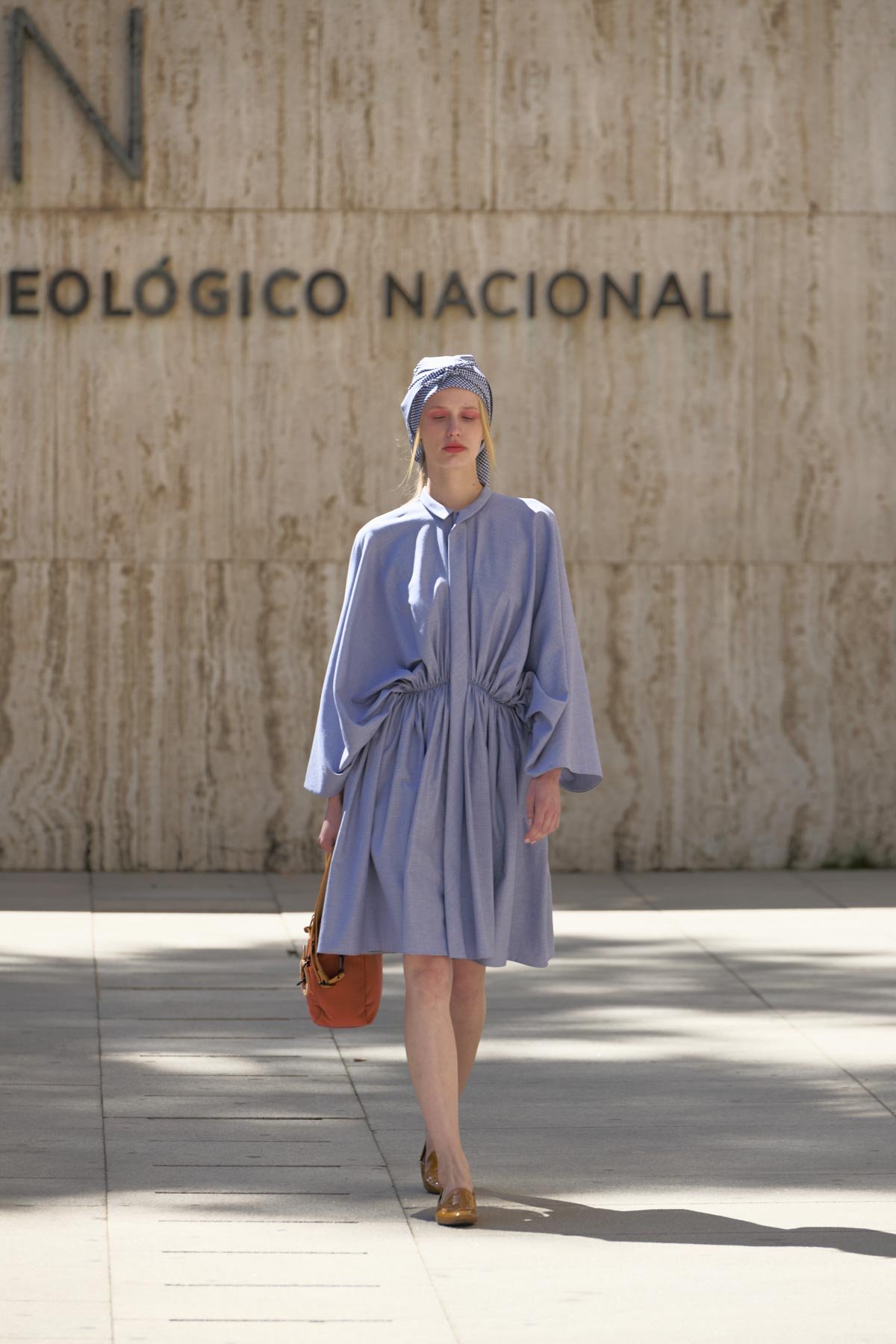 Los tejidos protagonistas de la colección son los algodones de cuadros vichy, suaves y ligeros, que contrastan con linos y sedas lisas en tonos monocolor. En la paleta de colores, el azul se impone como hilo conductor. Para completar la propuesta, la firma incluye sombreros Sancosmeiro hechos a mano con paja de centeno del Castillo de Vimianzo y mocasines de piel y bolsos firmados por Devota & Lomba.
