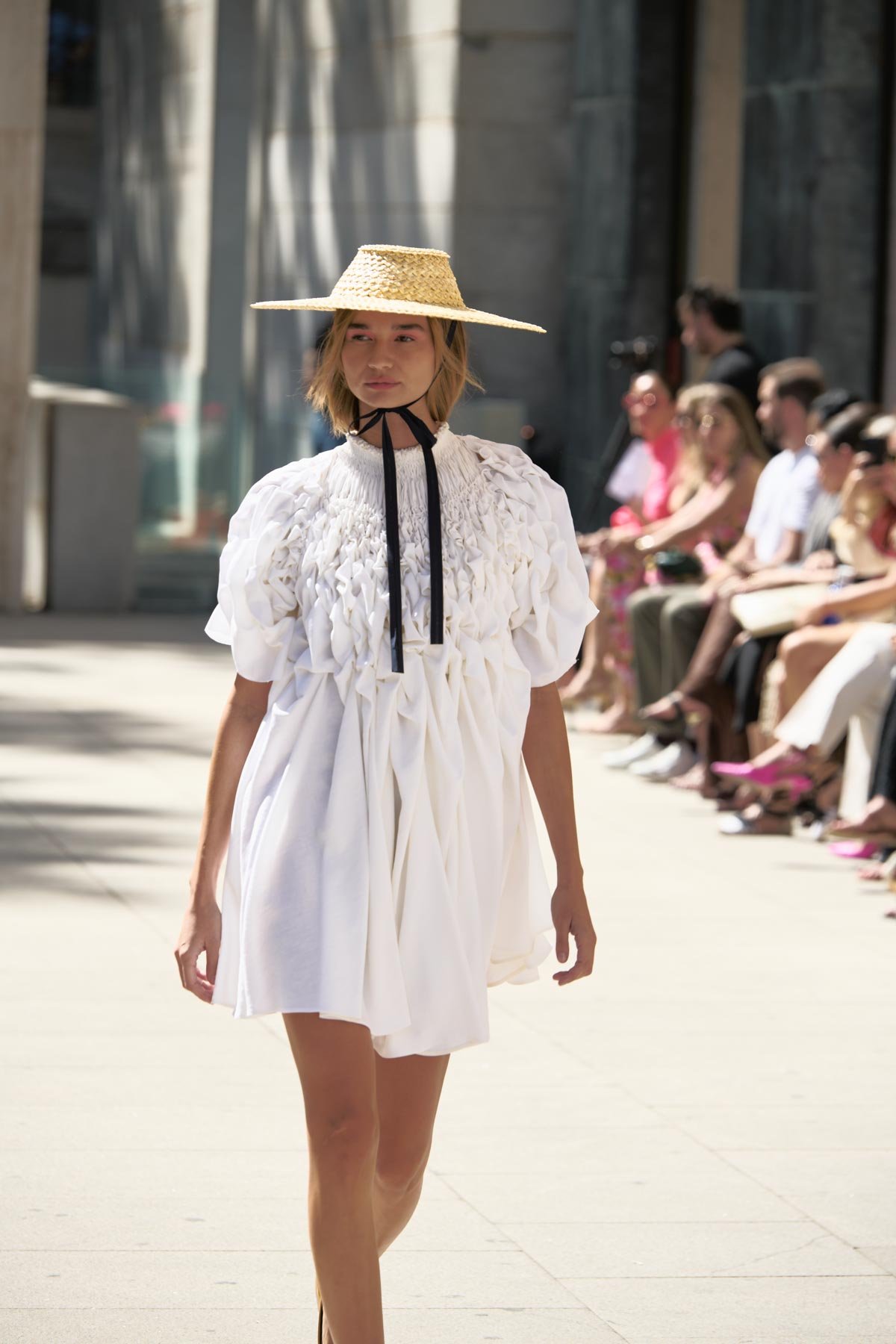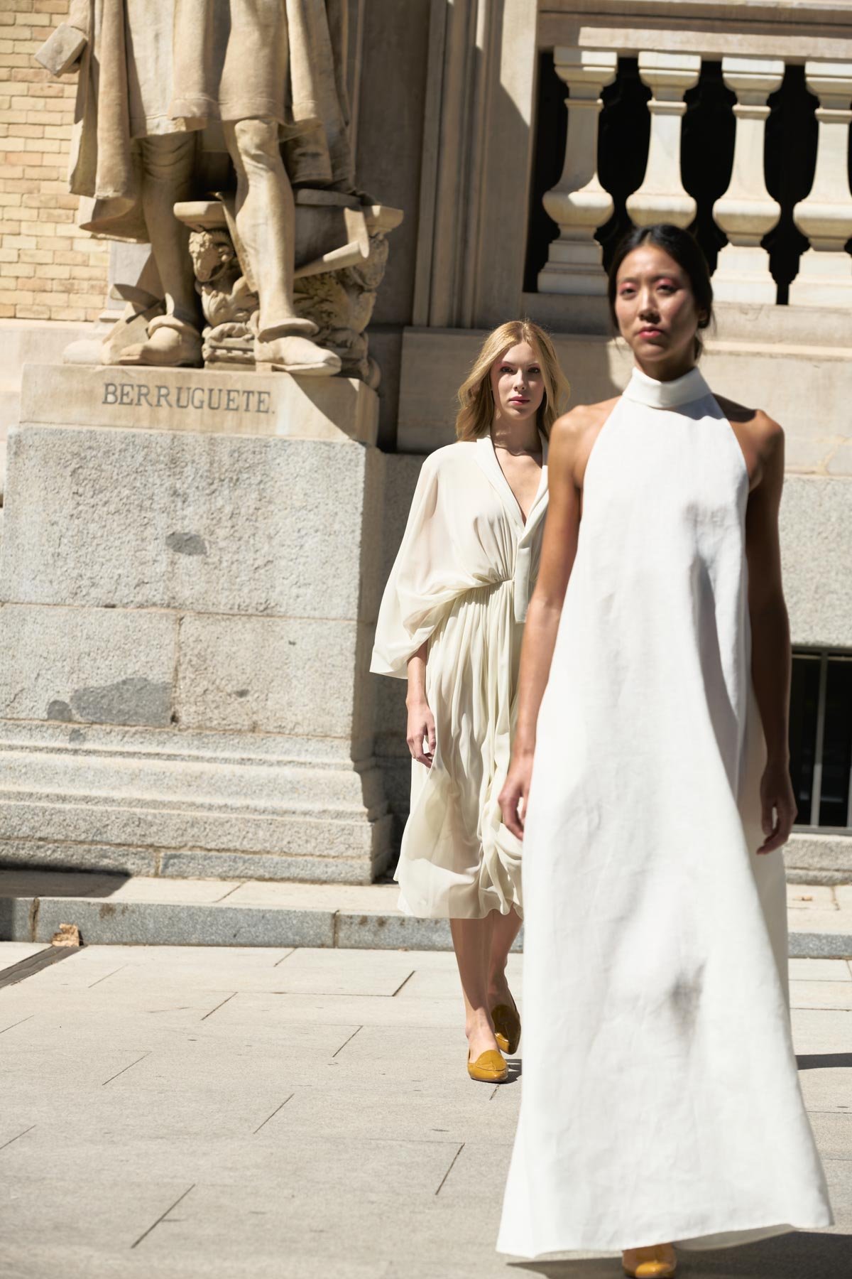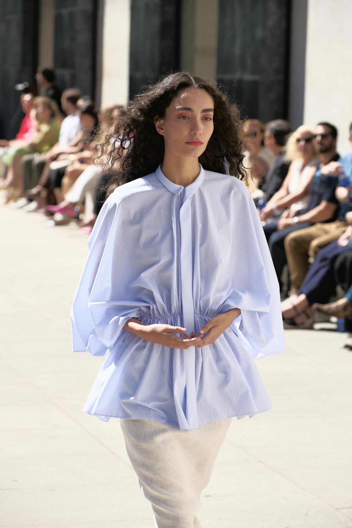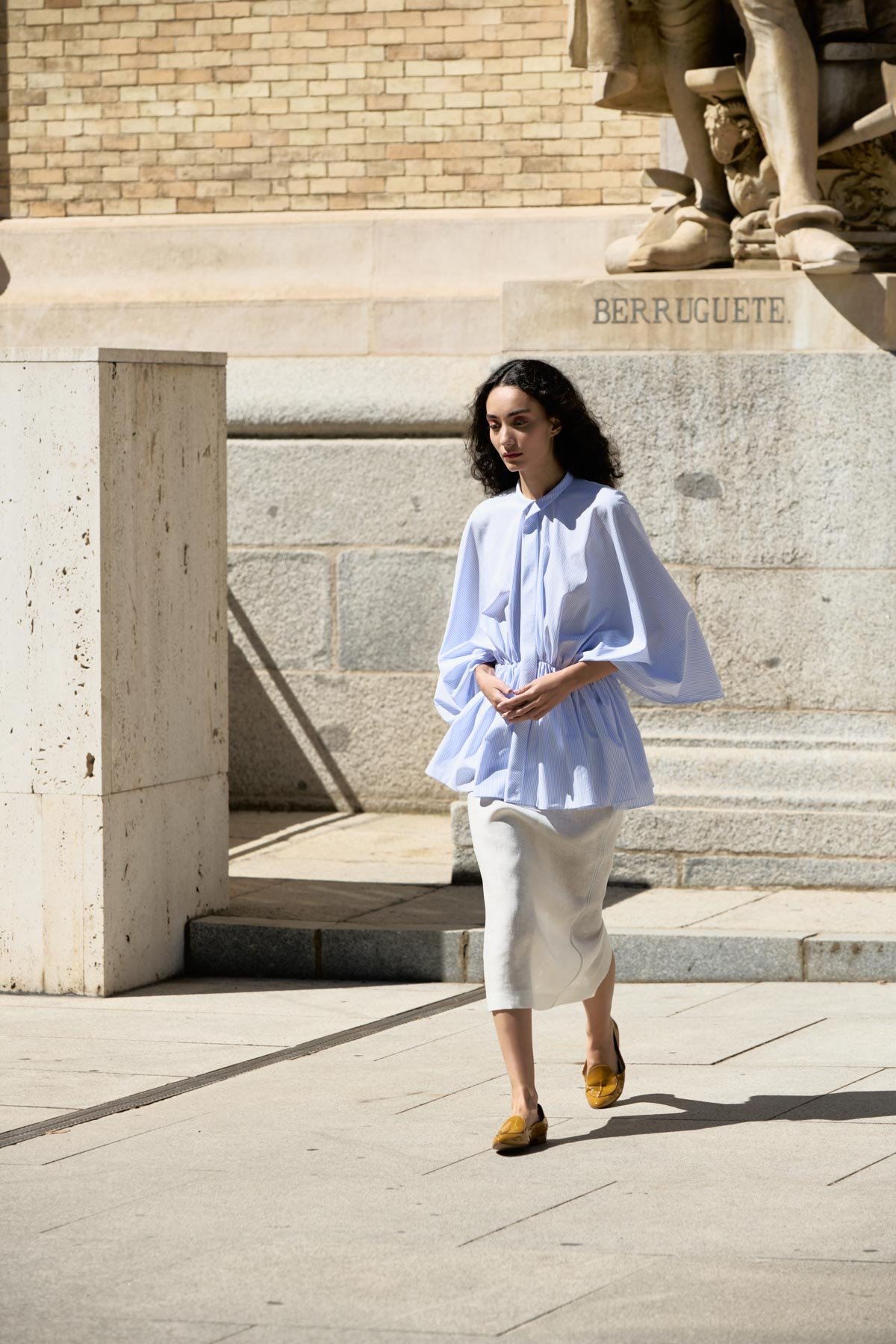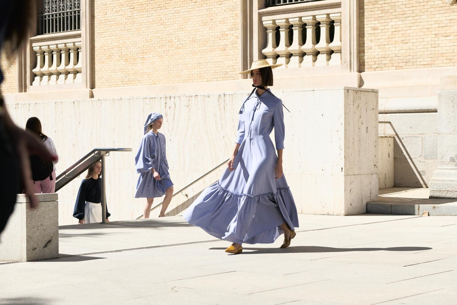 La colección de Devota & Lomba se inspira en los veranos de Sorolla, evocando su luz y atmósfera a través de formas volumétricas construidas con fruncidos. El tejido se ciñe para luego ser liberado, un contraste que no se puede apreciar sin discernir la opresión o el límite y el acto de soltarlo. No existe una acción sin la otra, la dialéctica de los extremos.