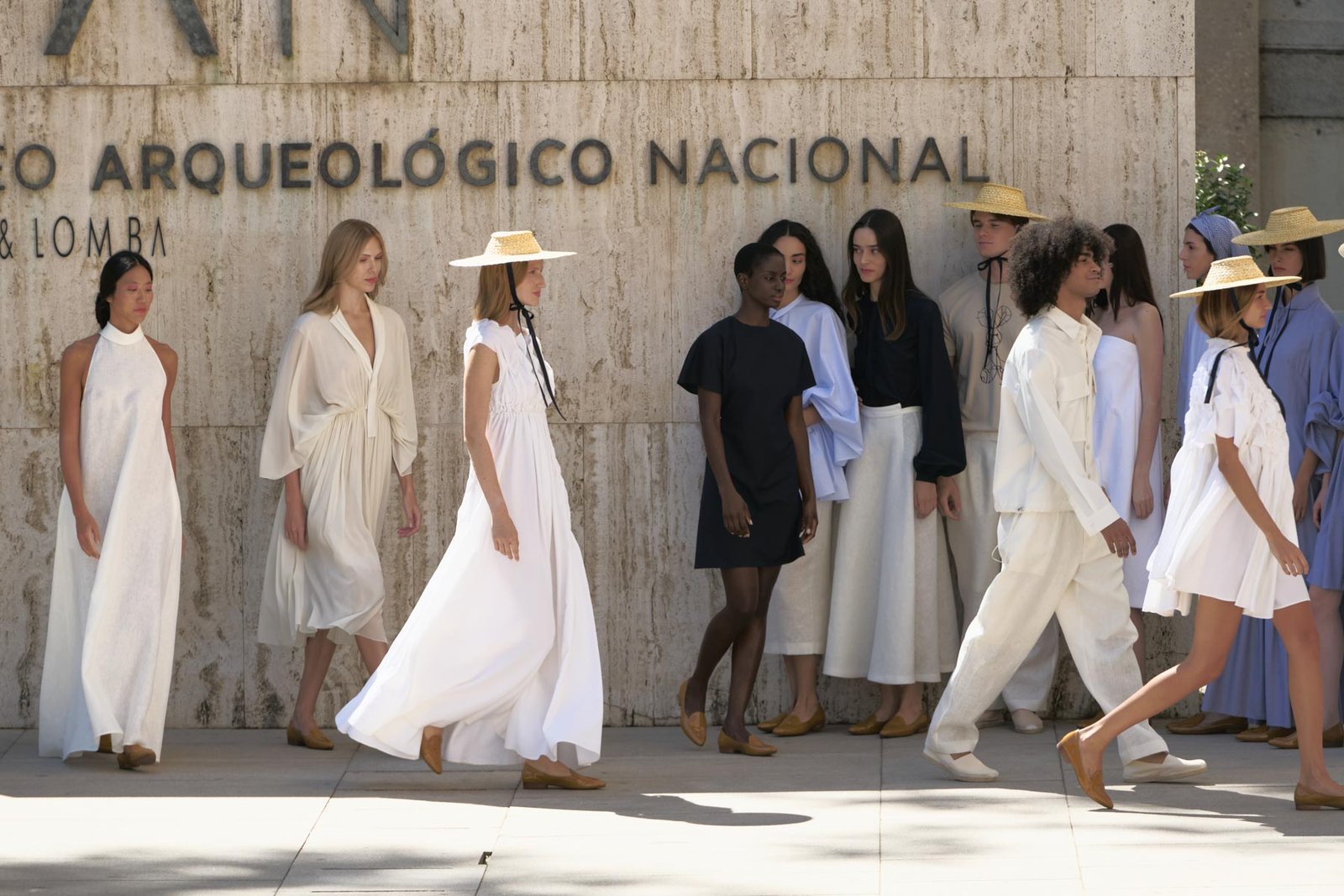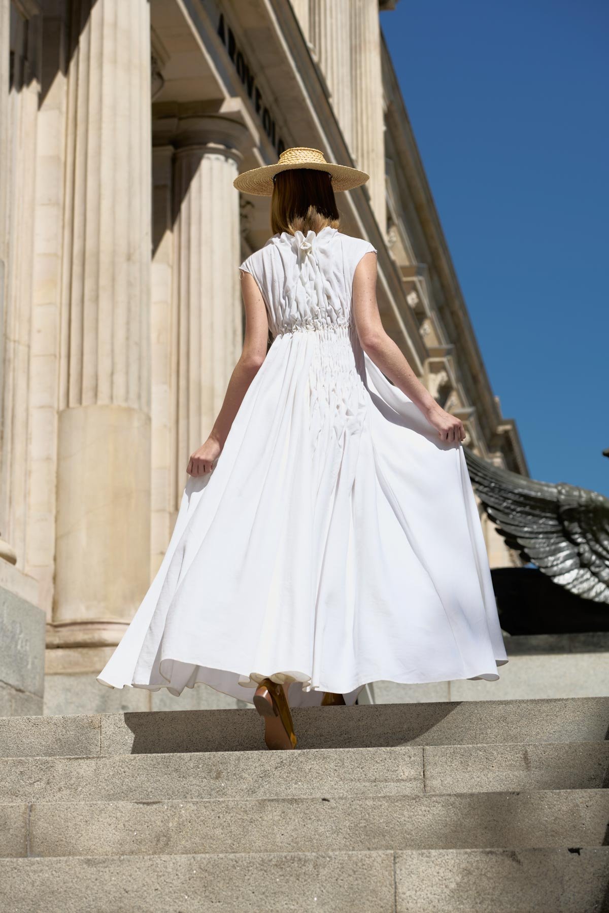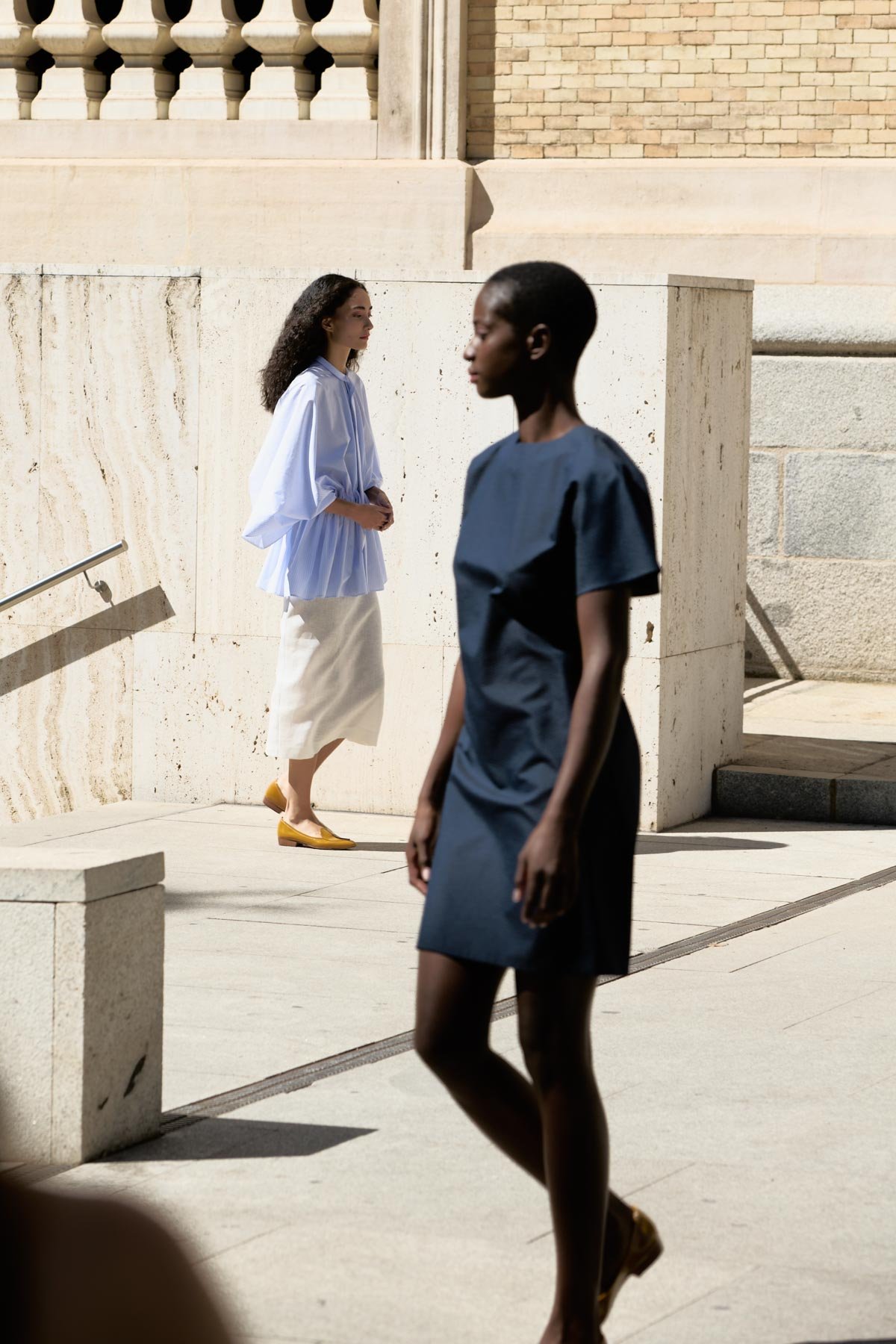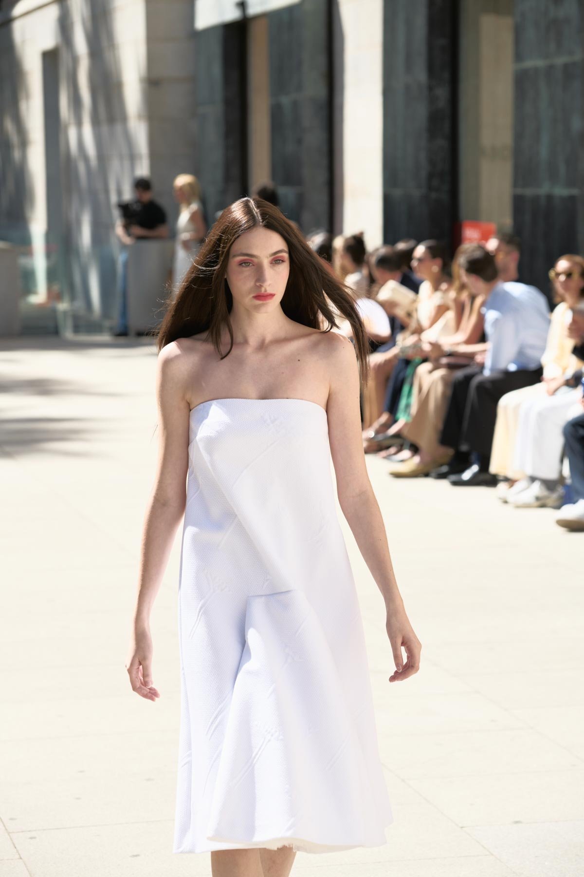 La colección de Devota & Lomba se inspira en los veranos de Sorolla, evocando su luz y atmósfera a través de formas volumétricas construidas con fruncidos. El tejido se ciñe para luego ser liberado, un contraste que no se puede apreciar sin discernir la opresión o el límite y el acto de soltarlo. No existe una acción sin la otra, la dialéctica de los extremos.