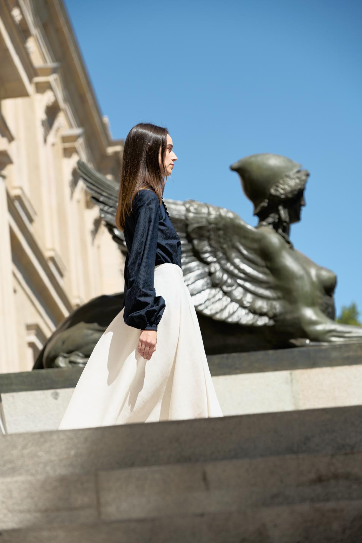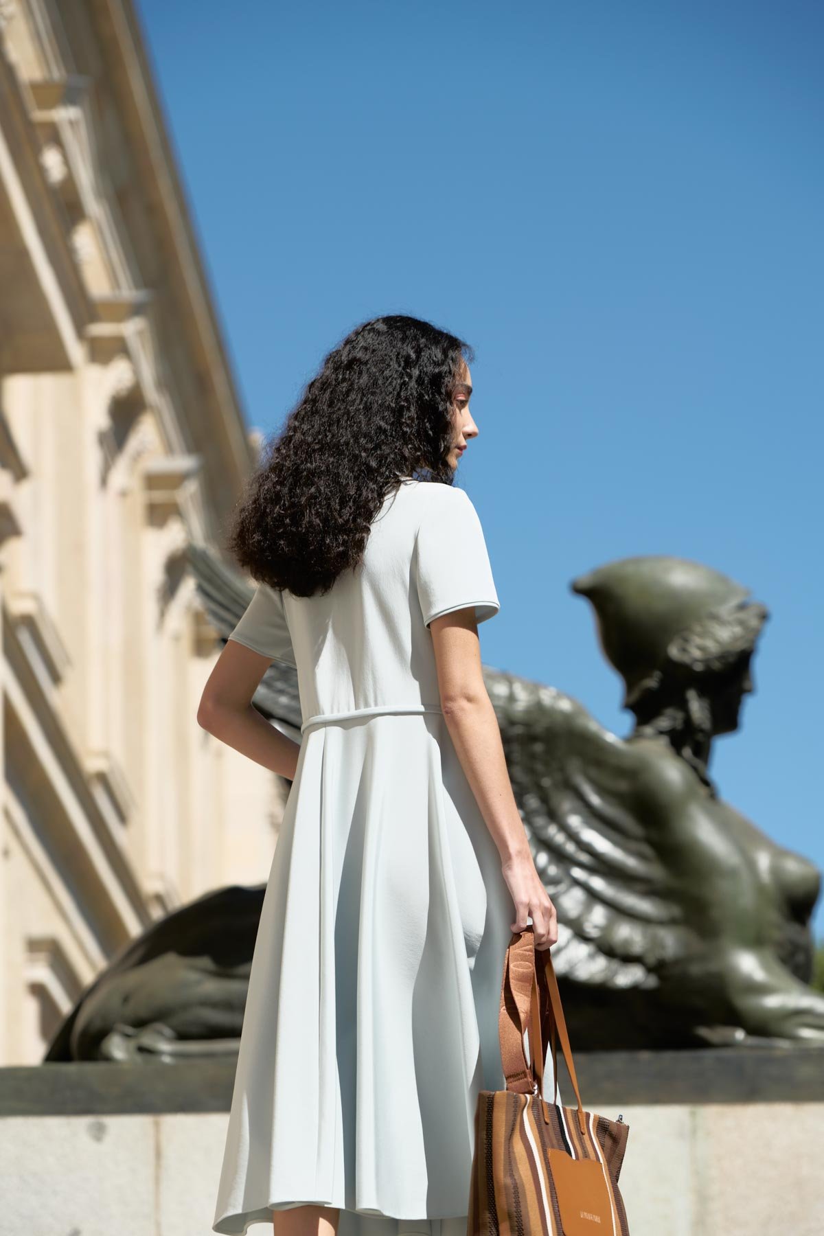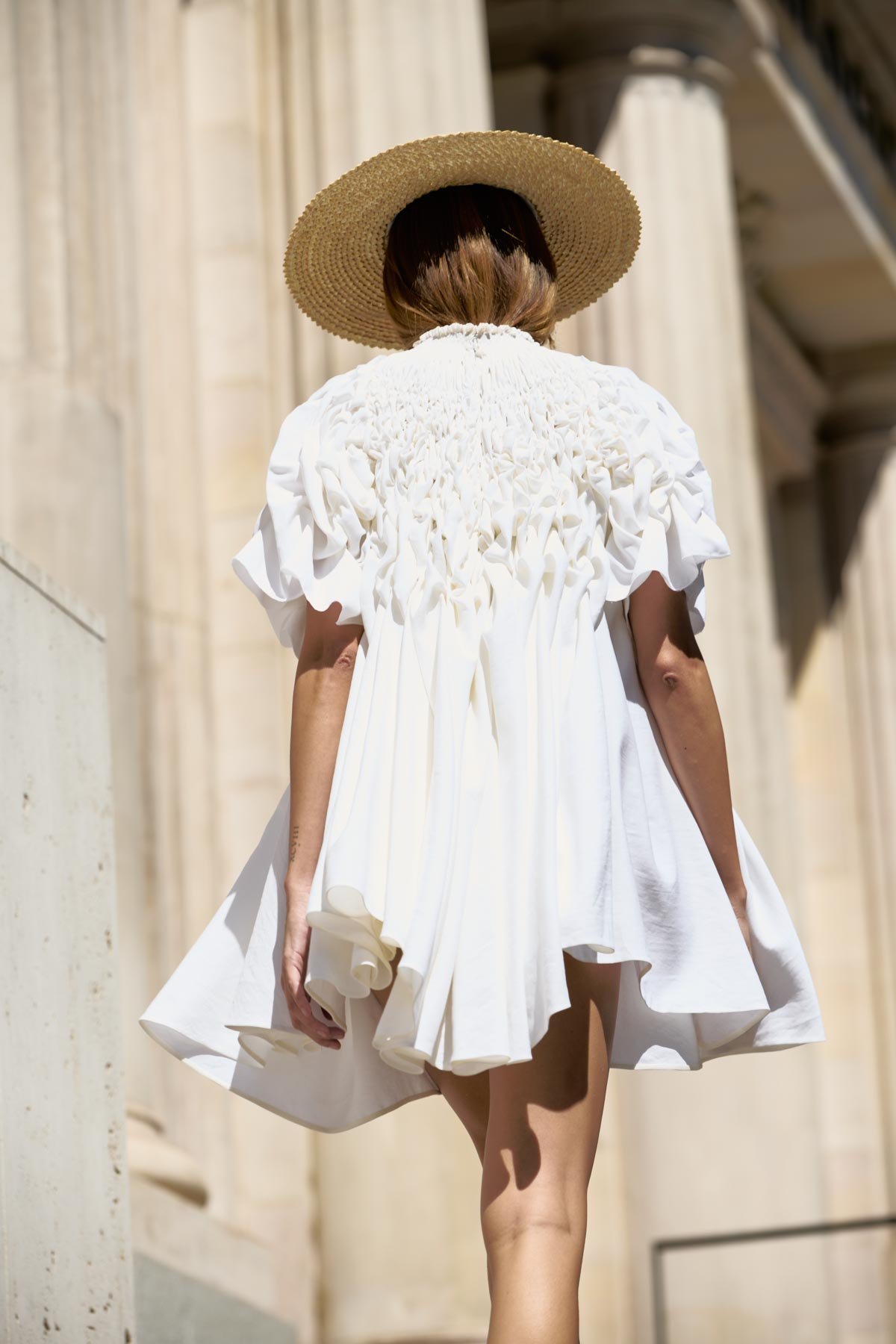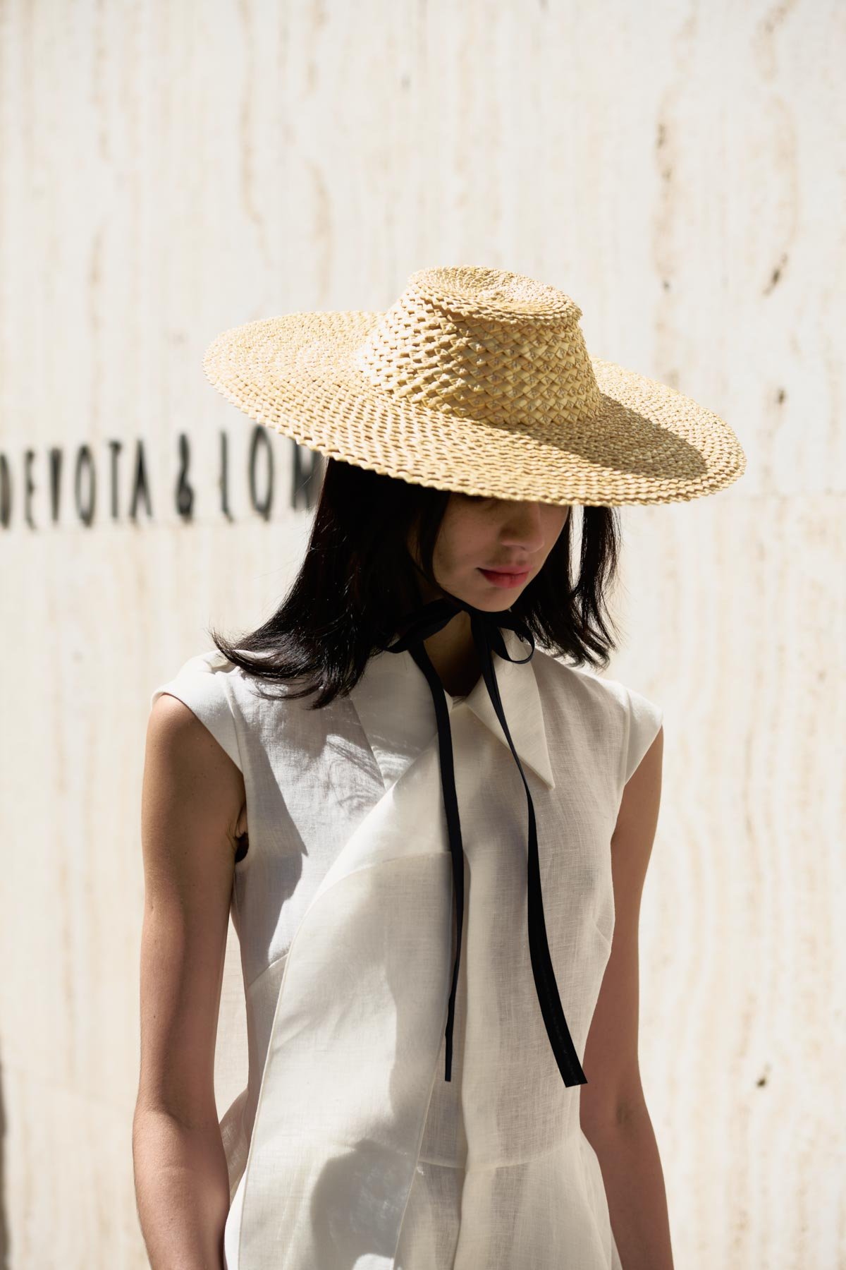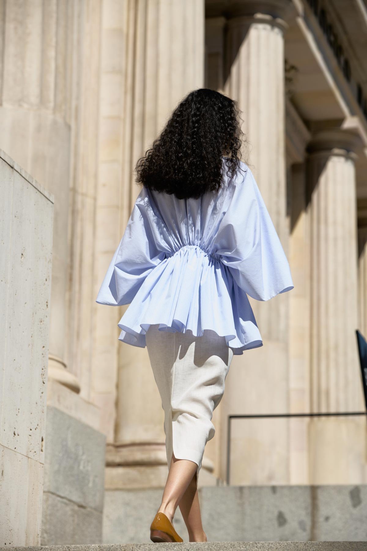 La colección de Devota & Lomba se inspira en los veranos de Sorolla, evocando su luz y atmósfera a través de formas volumétricas construidas con fruncidos. El tejido se ciñe para luego ser liberado, un contraste que no se puede apreciar sin discernir la opresión o el límite y el acto de soltarlo. No existe una acción sin la otra, la dialéctica de los extremos.