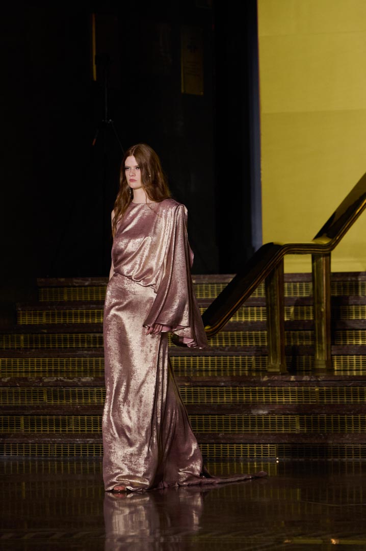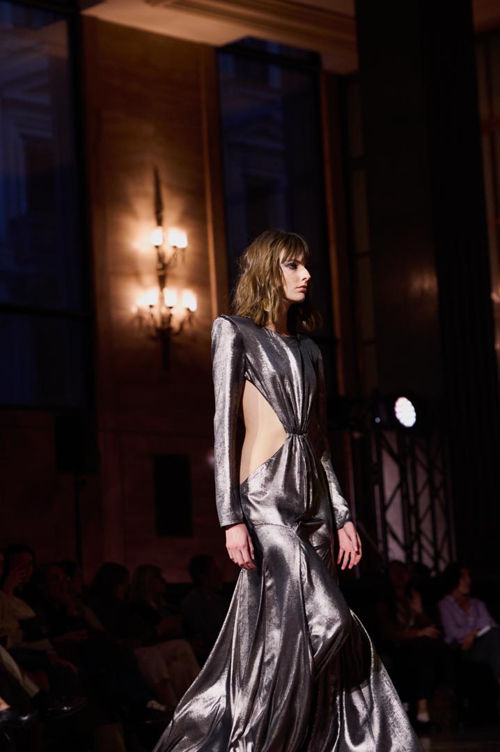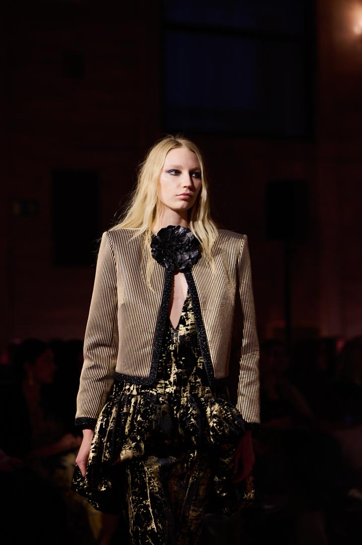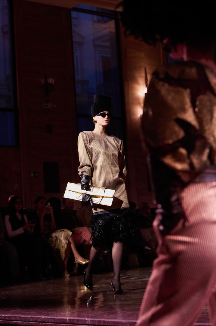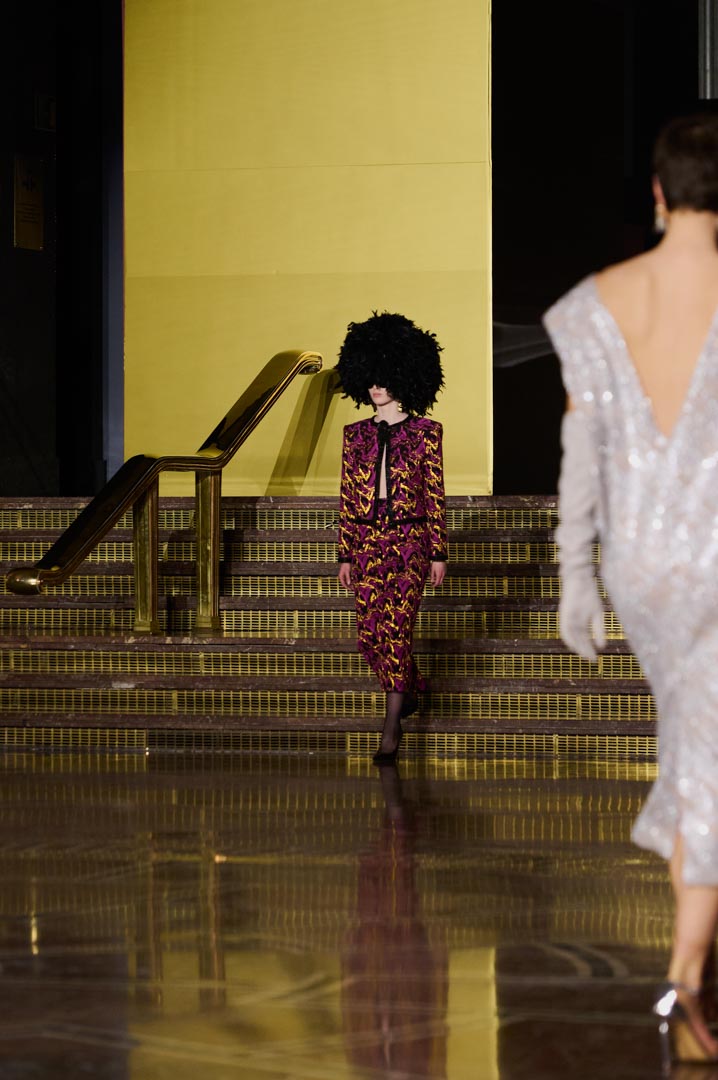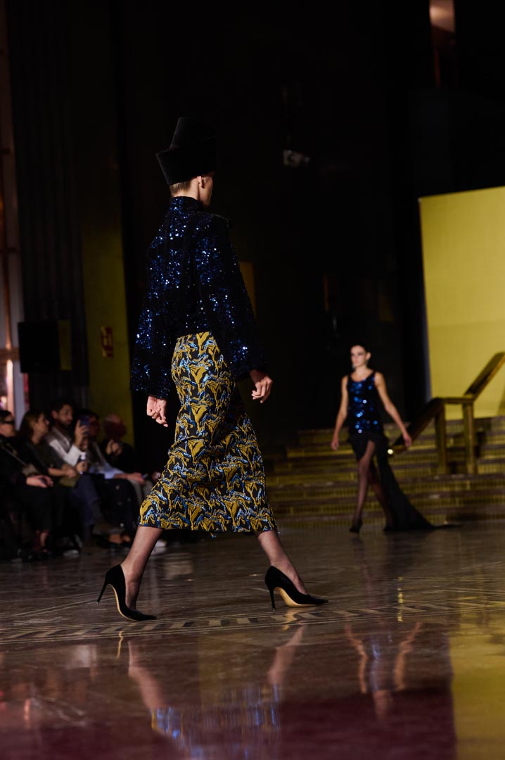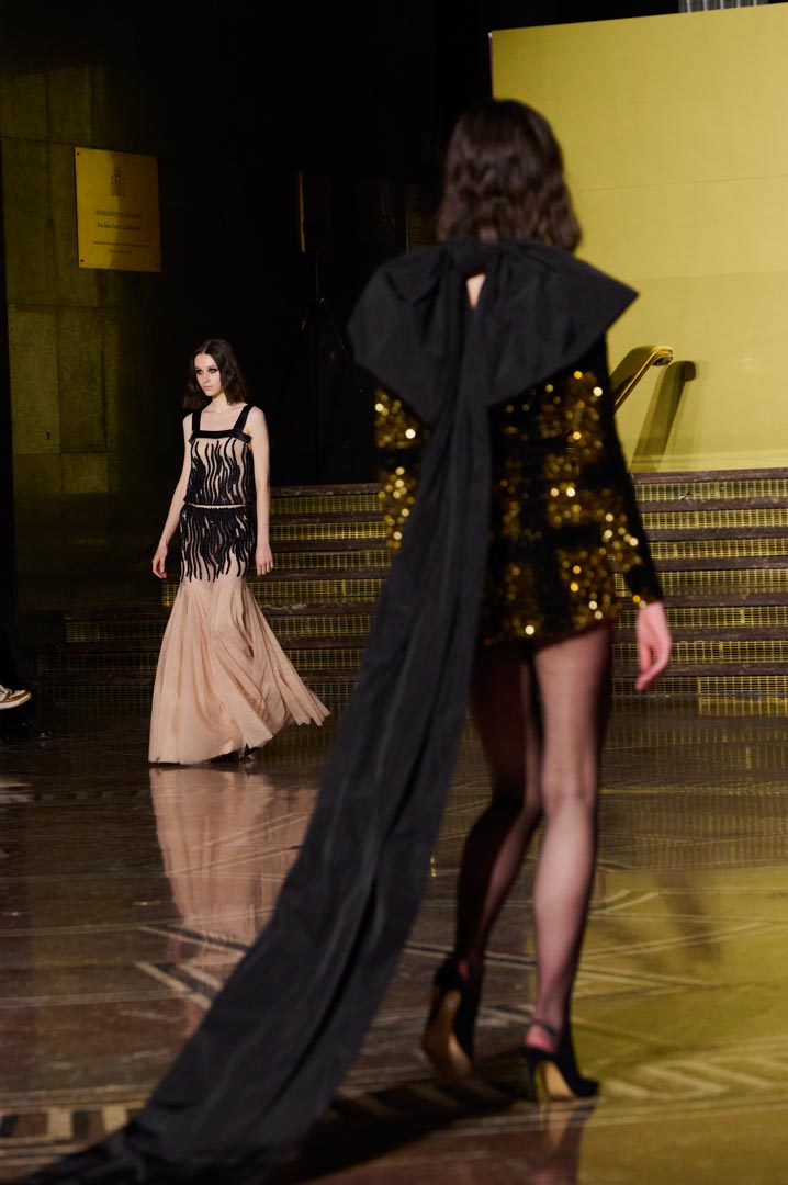 La propuesta se centra en siluetas estructuradas, hombros marcados, trajes de chaqueta, drapeados estratégicos, vestidos fluidos y lazadas de inspiración arquitectónica. La paleta resplandece con oro refulgente, azul eléctrico, magenta audaz, plata fulgurante y negro profundo. Los tejidos como el jacquard, terciopelo, moiré, brocado, devoré, tafetán y tartán con paillettes y mostacillas bordadas, se reinterpretan para un uso contemporáneo.