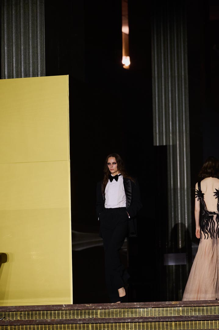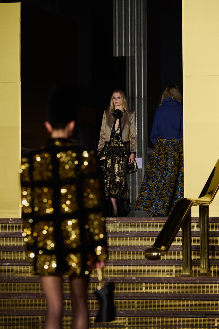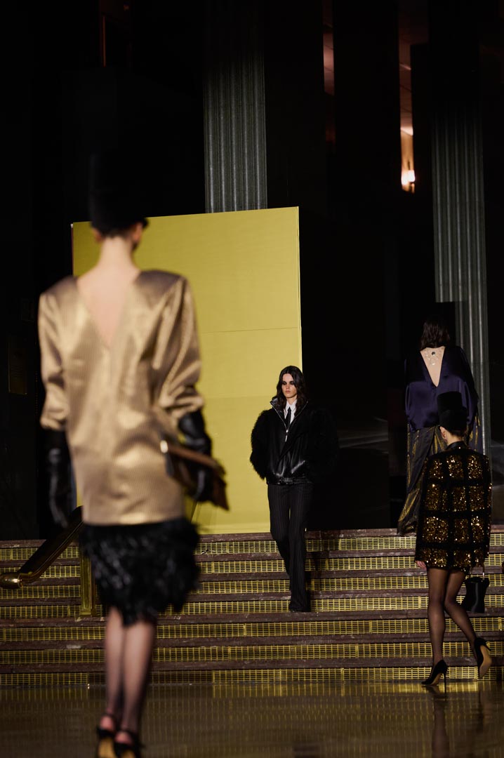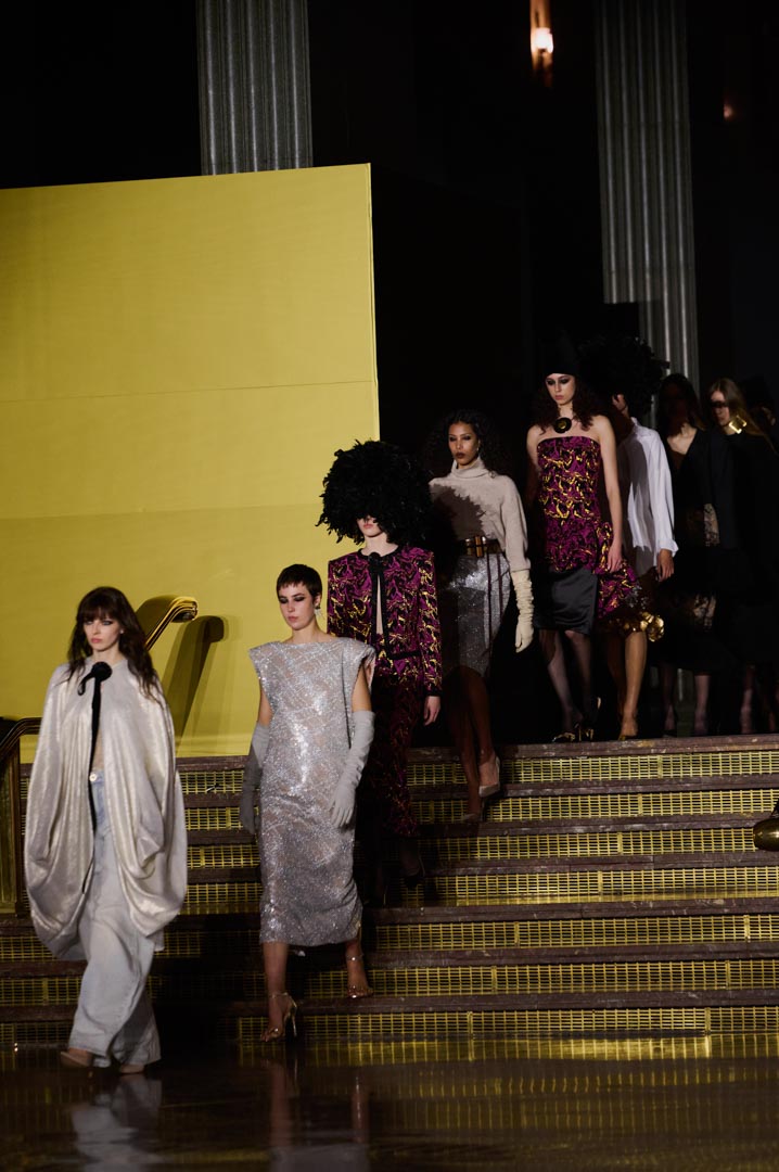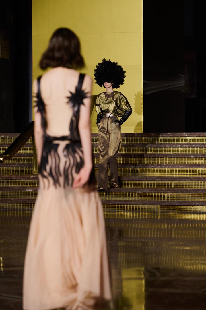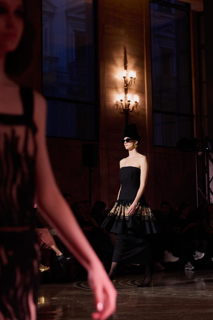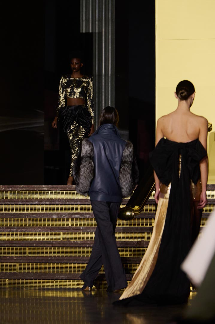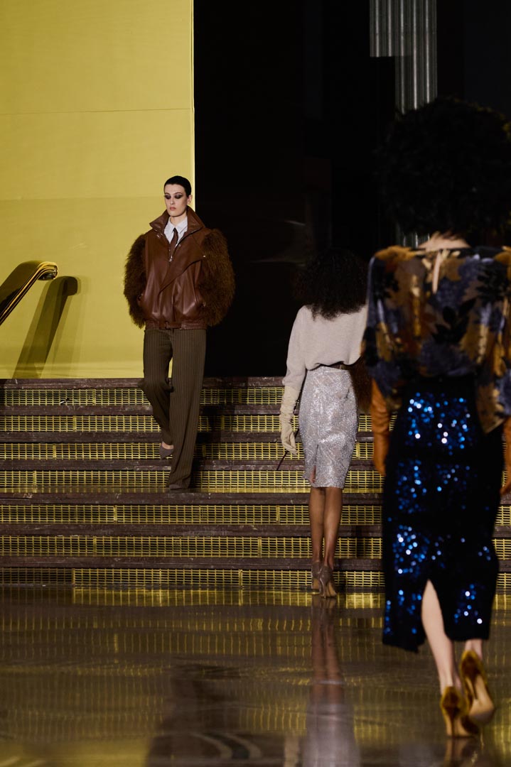 La propuesta se centra en siluetas estructuradas, hombros marcados, trajes de chaqueta, drapeados estratégicos, vestidos fluidos y lazadas de inspiración arquitectónica. La paleta resplandece con oro refulgente, azul eléctrico, magenta audaz, plata fulgurante y negro profundo. Los tejidos como el jacquard, terciopelo, moiré, brocado, devoré, tafetán y tartán con paillettes y mostacillas bordadas, se reinterpretan para un uso contemporáneo.