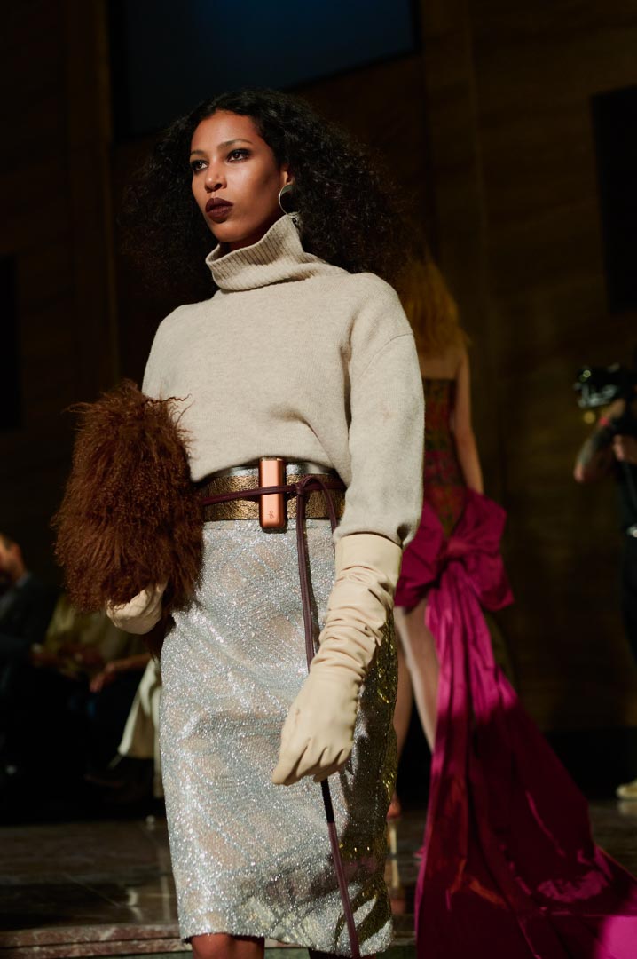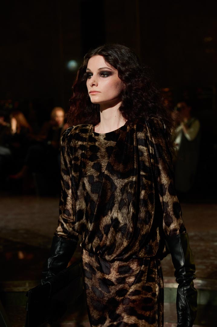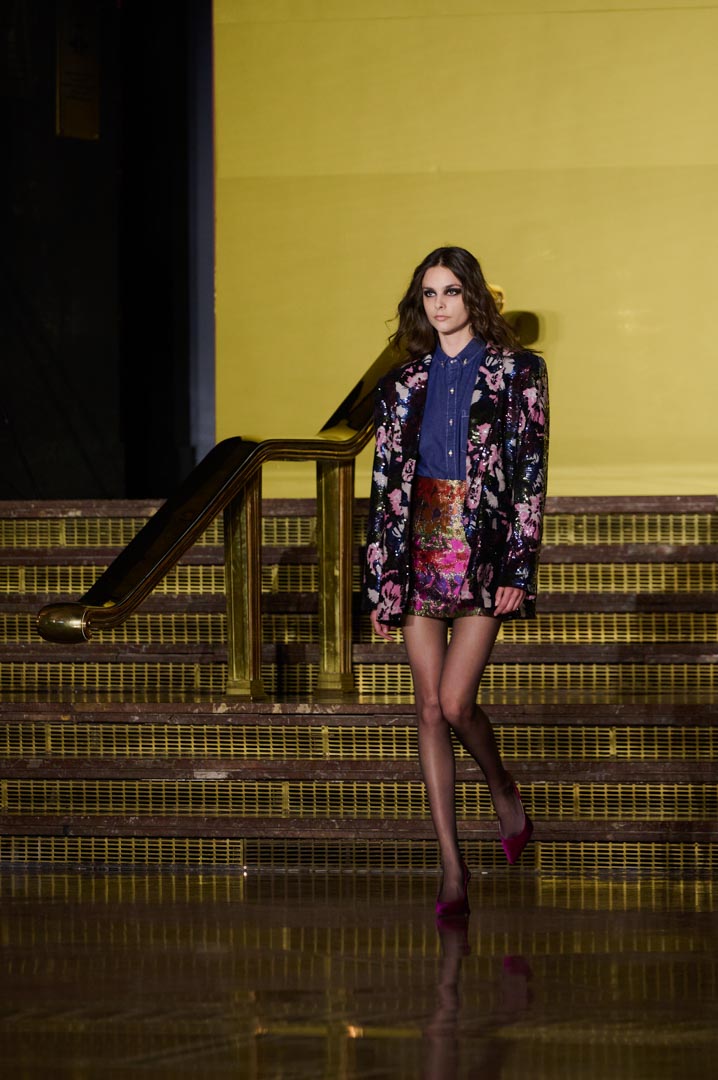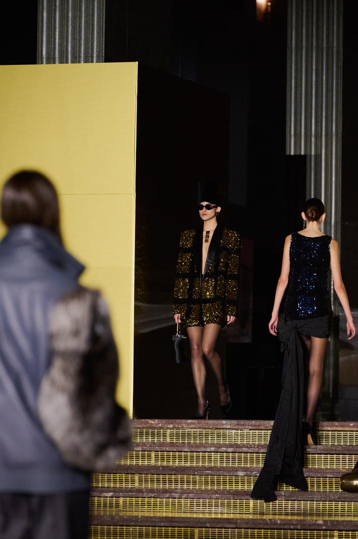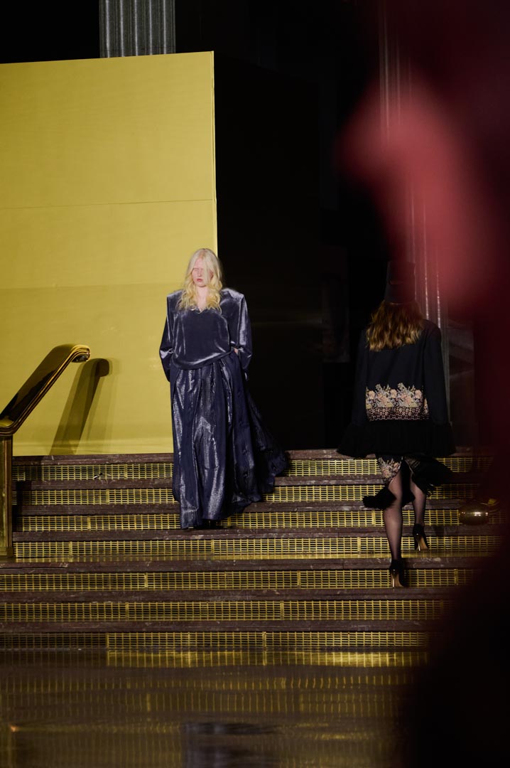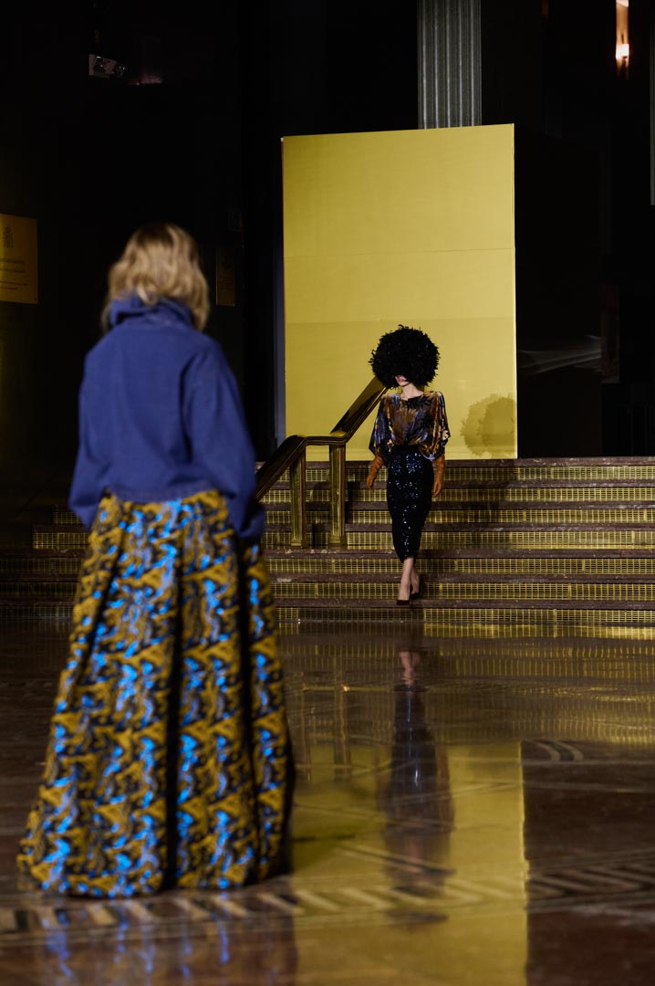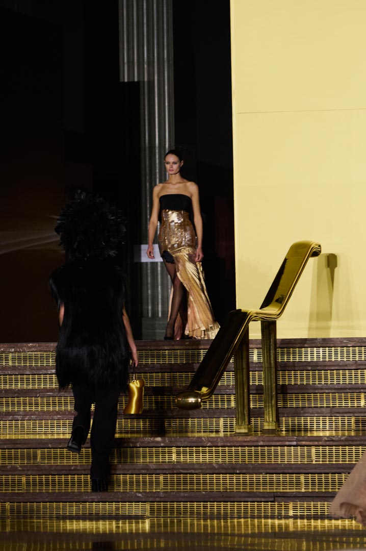 La propuesta se centra en siluetas estructuradas, hombros marcados, trajes de chaqueta, drapeados estratégicos, vestidos fluidos y lazadas de inspiración arquitectónica. La paleta resplandece con oro refulgente, azul eléctrico, magenta audaz, plata fulgurante y negro profundo. Los tejidos como el jacquard, terciopelo, moiré, brocado, devoré, tafetán y tartán con paillettes y mostacillas bordadas, se reinterpretan para un uso contemporáneo.