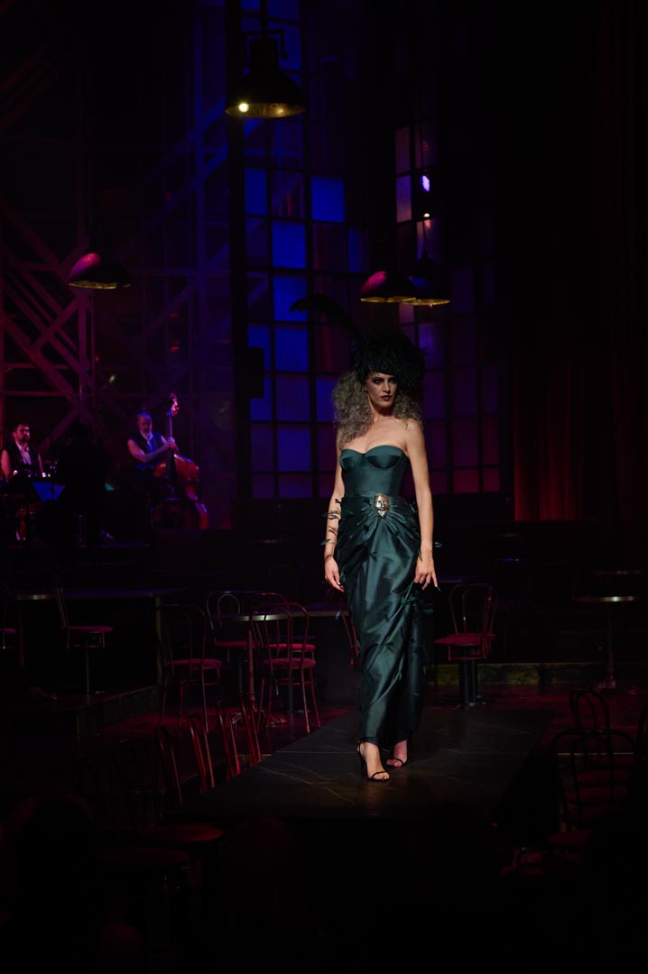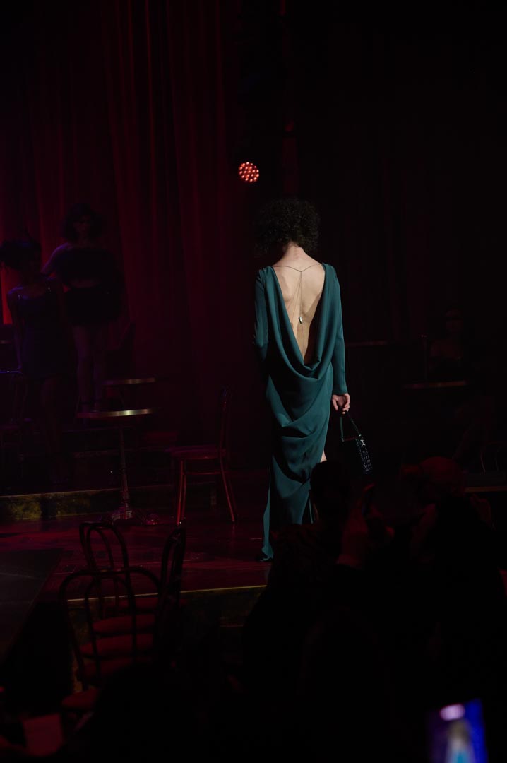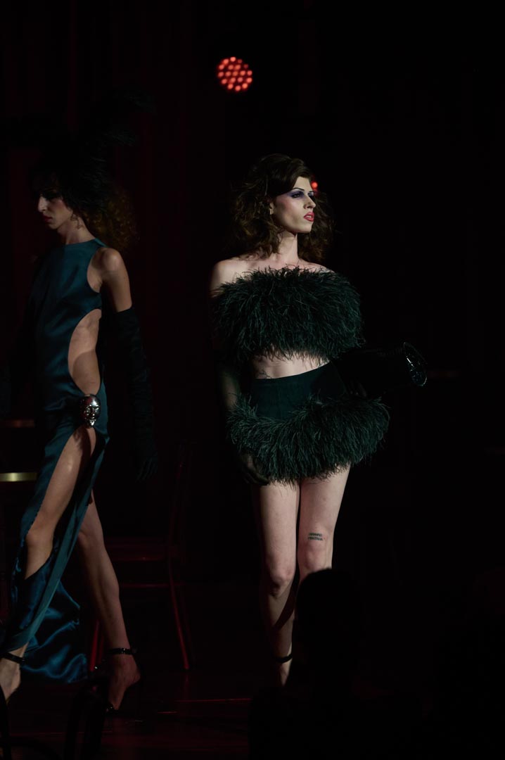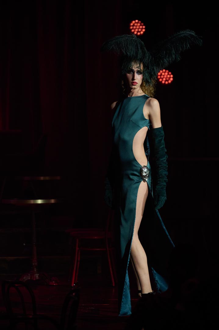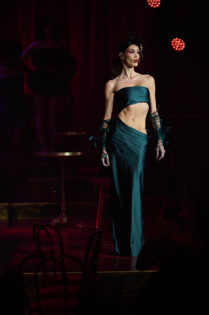Eduardo Navarrete presenta Verde, una colección inspirada en las mujeres que revolucionaron los cafés cantantes de principios del siglo XX con humor, picardía y sensualidad. Figuras como Tórtola Valencia sirven de referencia para una propuesta que recupera el espíritu de aquellas artistas que desafiaron las normas sociales a través de la insinuación, la ironía y el gesto provocador, dando lugar a lo que se conoció como la “ola verde”. Con iconos como Laura Sánchez y Pino Montesdeoca sobre la pasarela y la actuación en directo de Asier Etxeandía, la presentación refuerza el carácter escénico de una colección donde el verde, único color protagonista, simboliza deseo, provocación elegante y libertad reinterpretados desde la mirada contemporánea del diseñador.