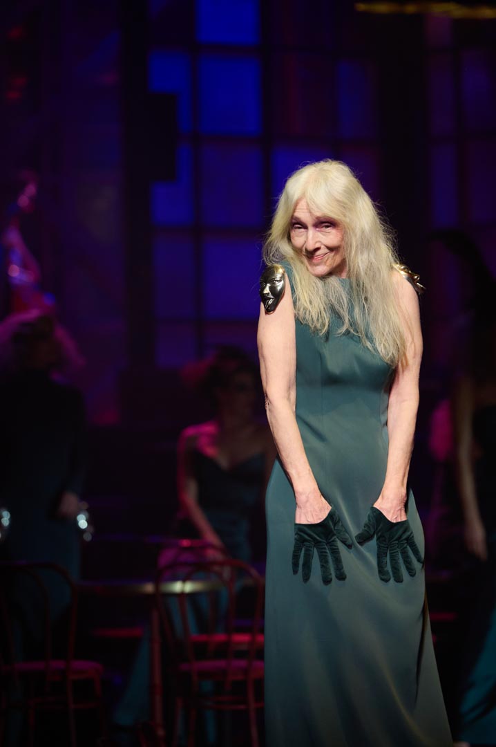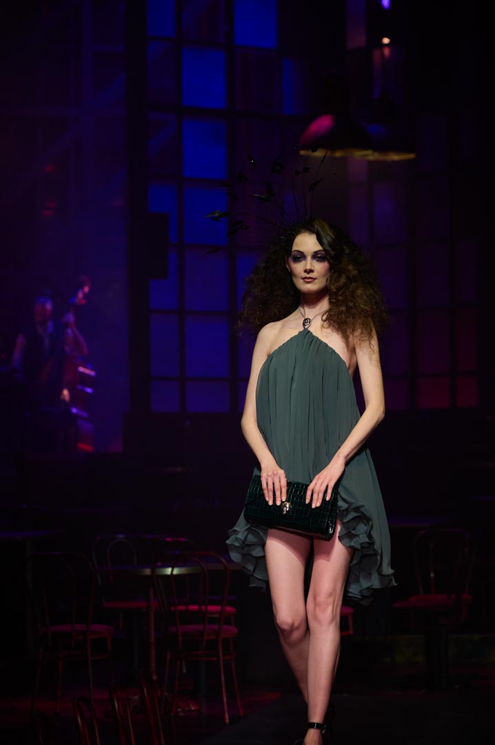 Compuesta por veinte looks de noche realizados en tejidos nobles como satén, gasa y organza, la colección se desarrolla en una única tonalidad lograda mediante el teñido artesanal de todos los materiales. Plumas de avestruz, gallo y faisán rematan algunos vestidos y tocados, mientras que las emblemáticas caras insignia de la firma aparecen como apliques y broches forjados en plata envejecida.
