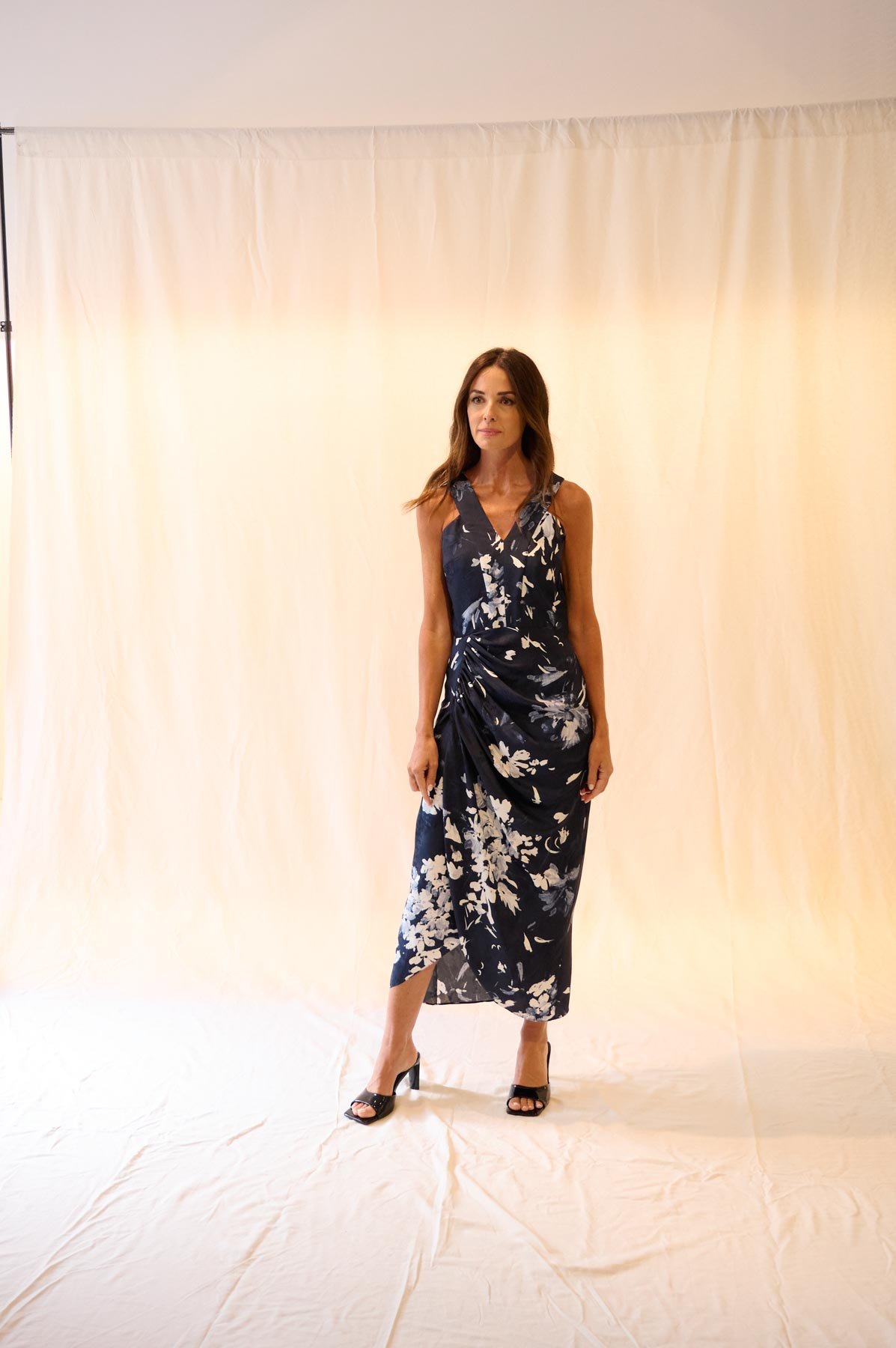 Tejidos como la gasa de seda y el crêpe de chine aportan fluidez y frescura a cada diseño. La artesanía se refleja en detalles cuidados como drapeados, cortes al bies y acabados meticulosos que evidencian el sello de la casa.