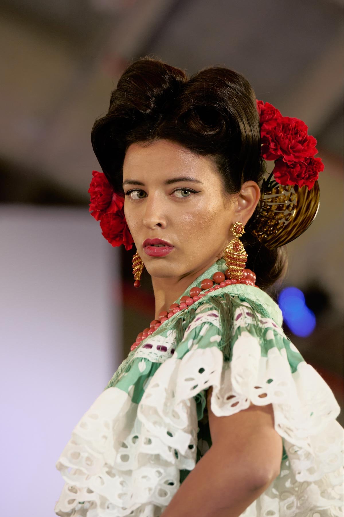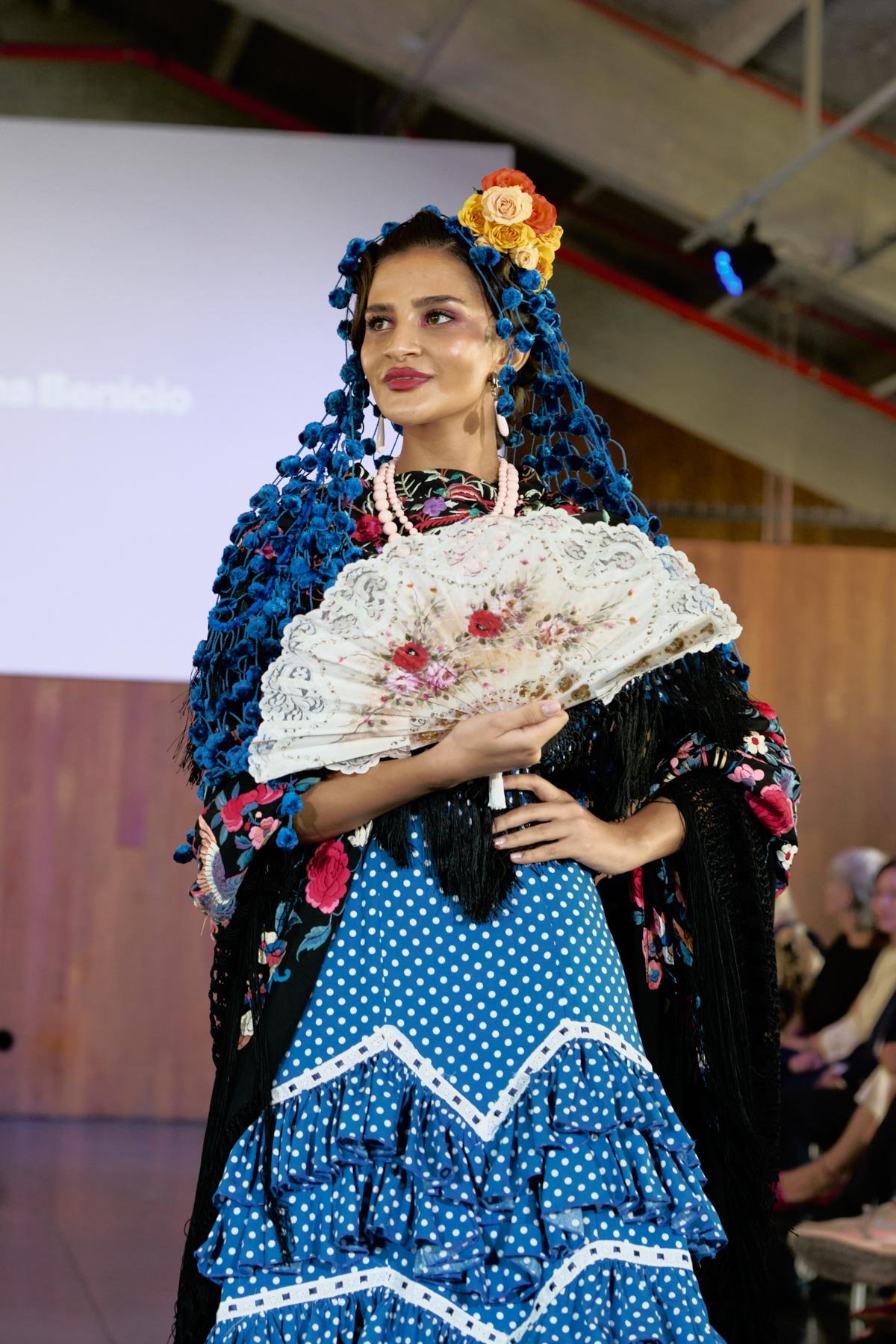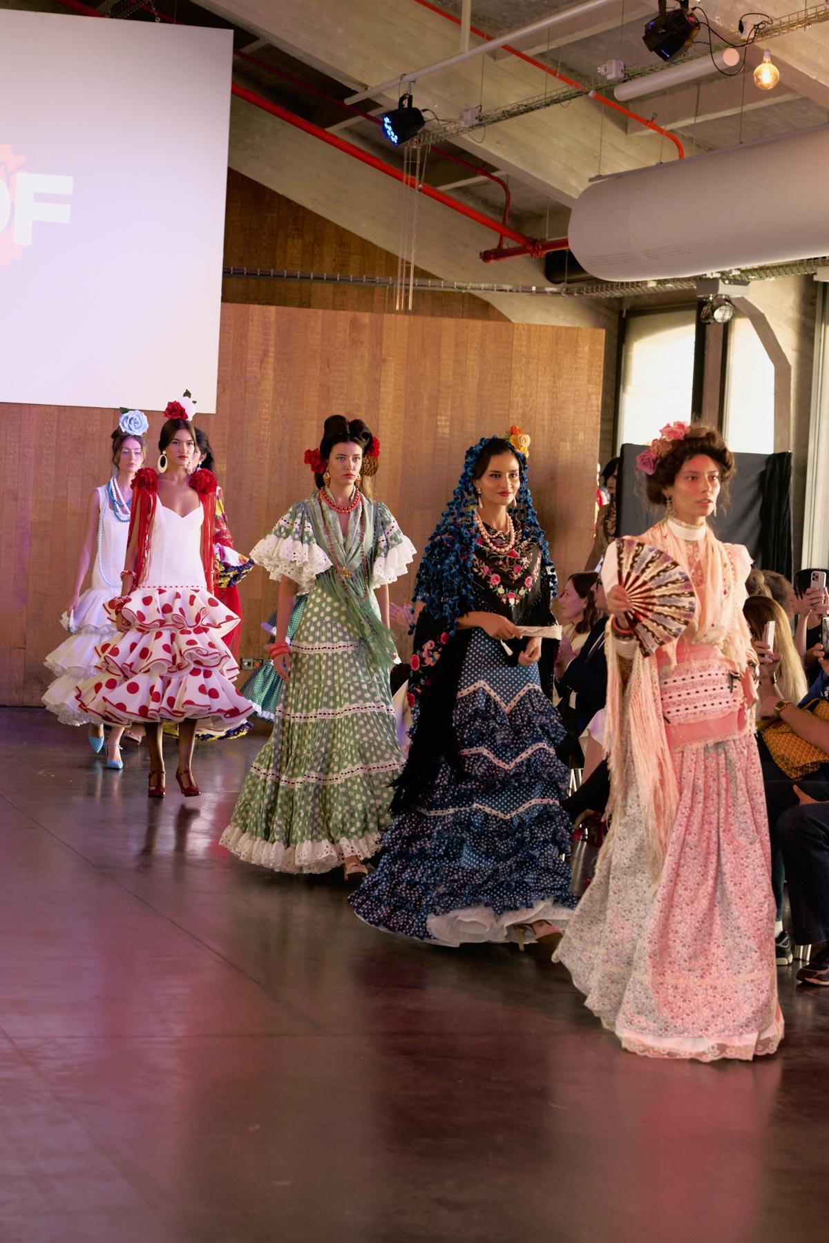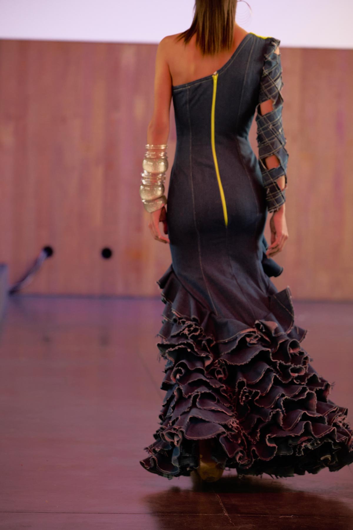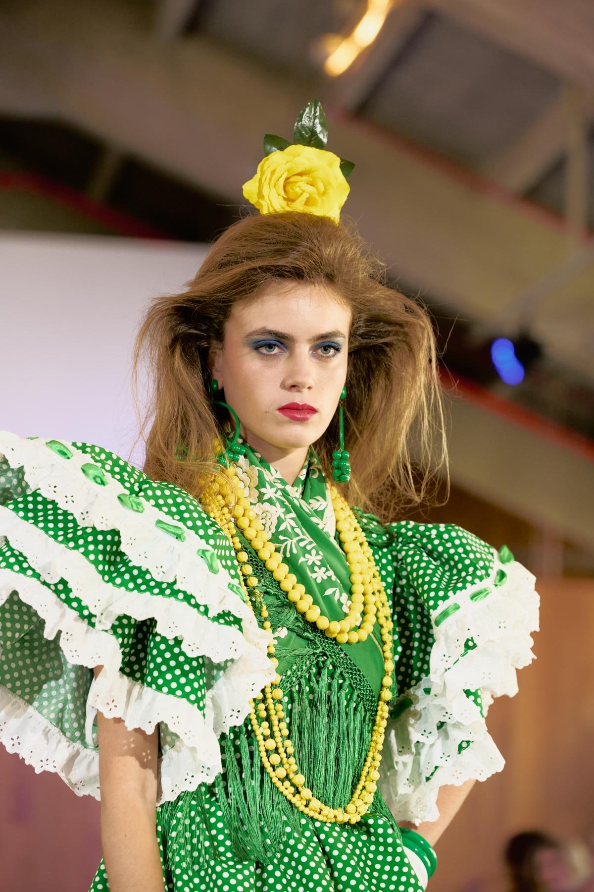 La propuesta se construye a partir de una paleta cromática rica donde predominan el negro, el azafrán, el añil, el verde musgo, el esmeralda o el azul cerúleo. Colores que cobran vida en tejidos como el algodón, el tul, la gasa o la seda rústica y en elementos clásicos del traje de flamenca, como los lunares oversize, los bordados florales y las rayas.