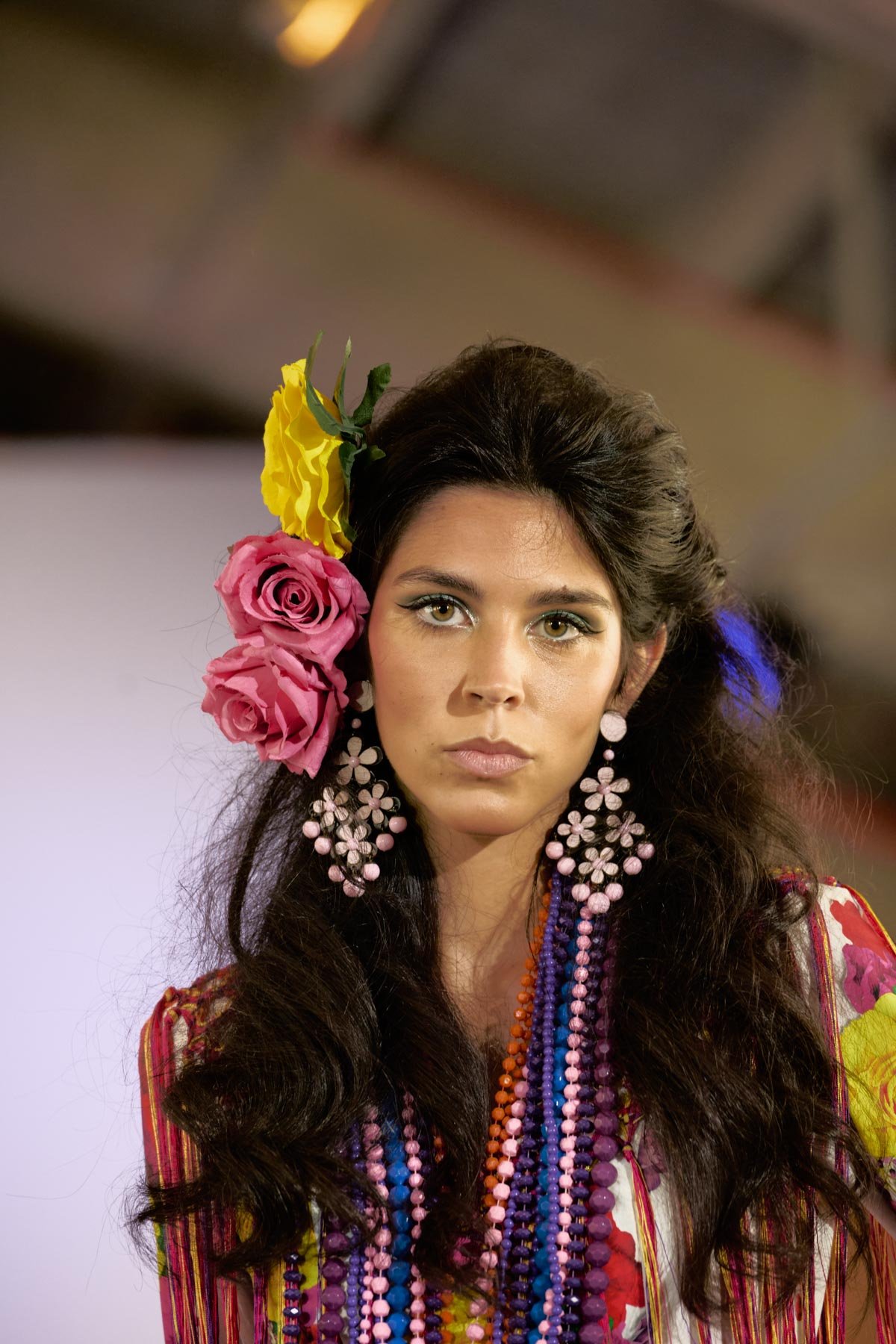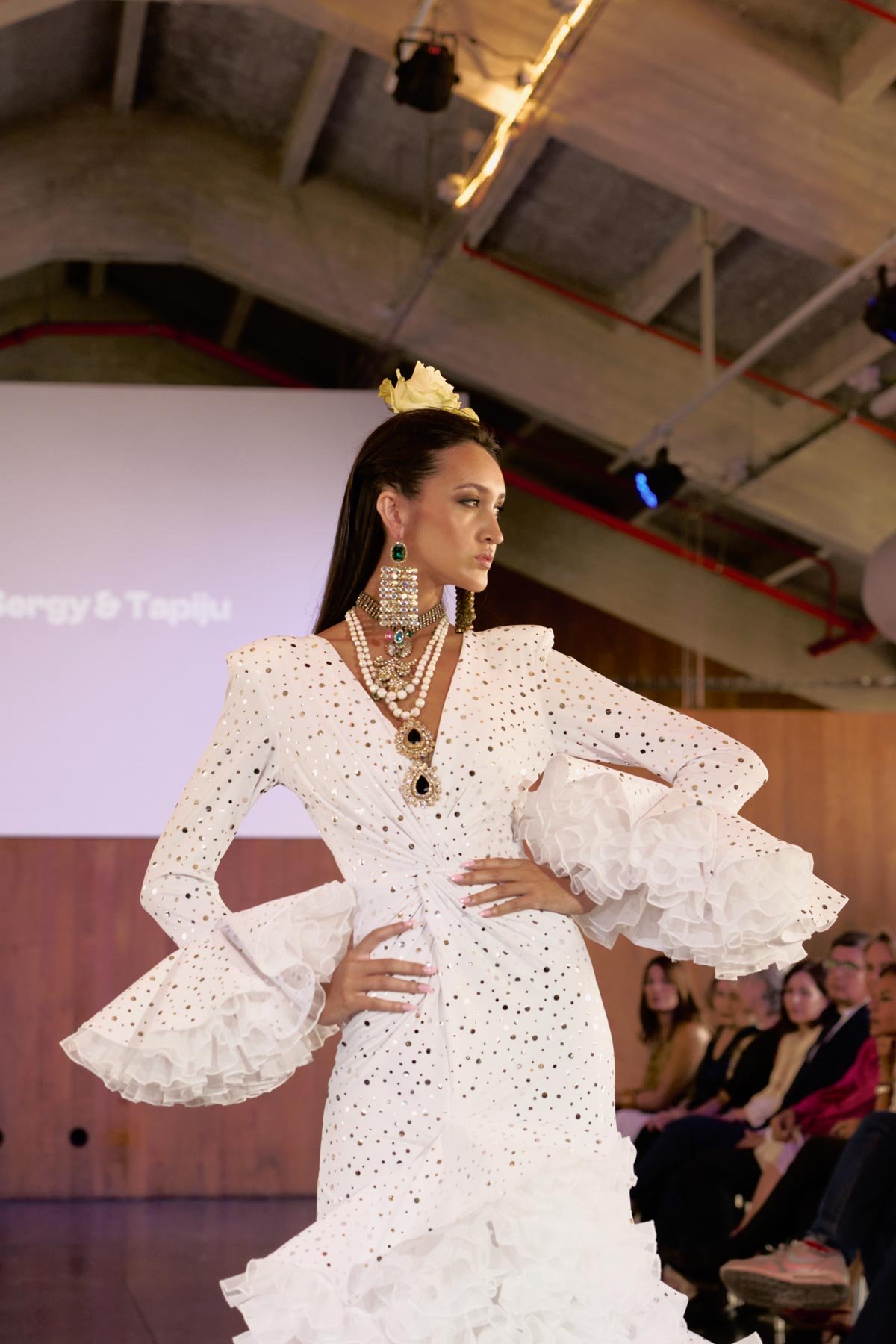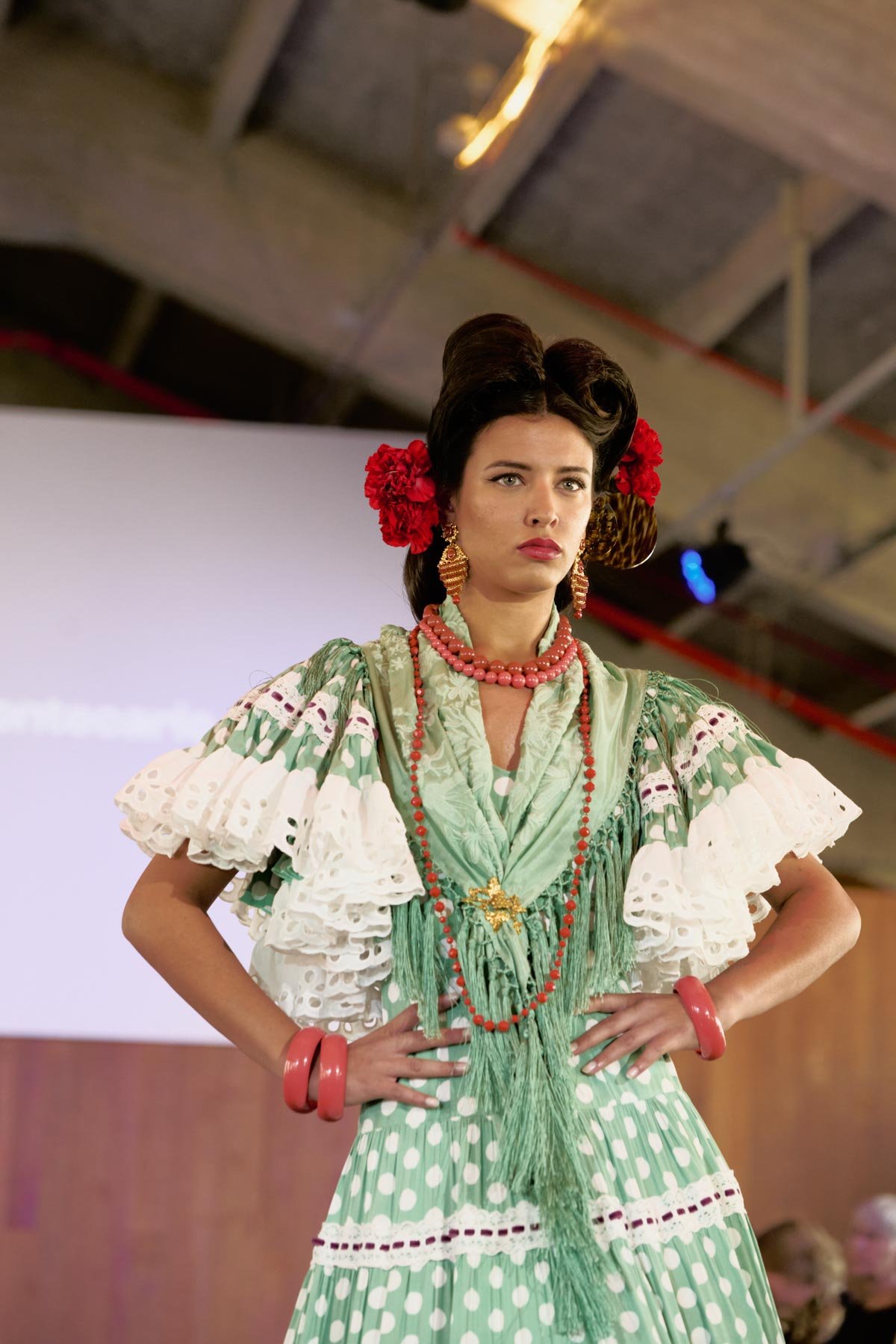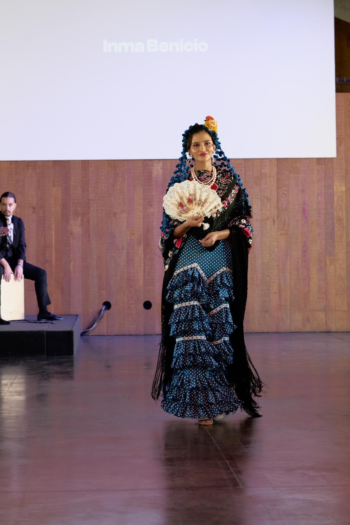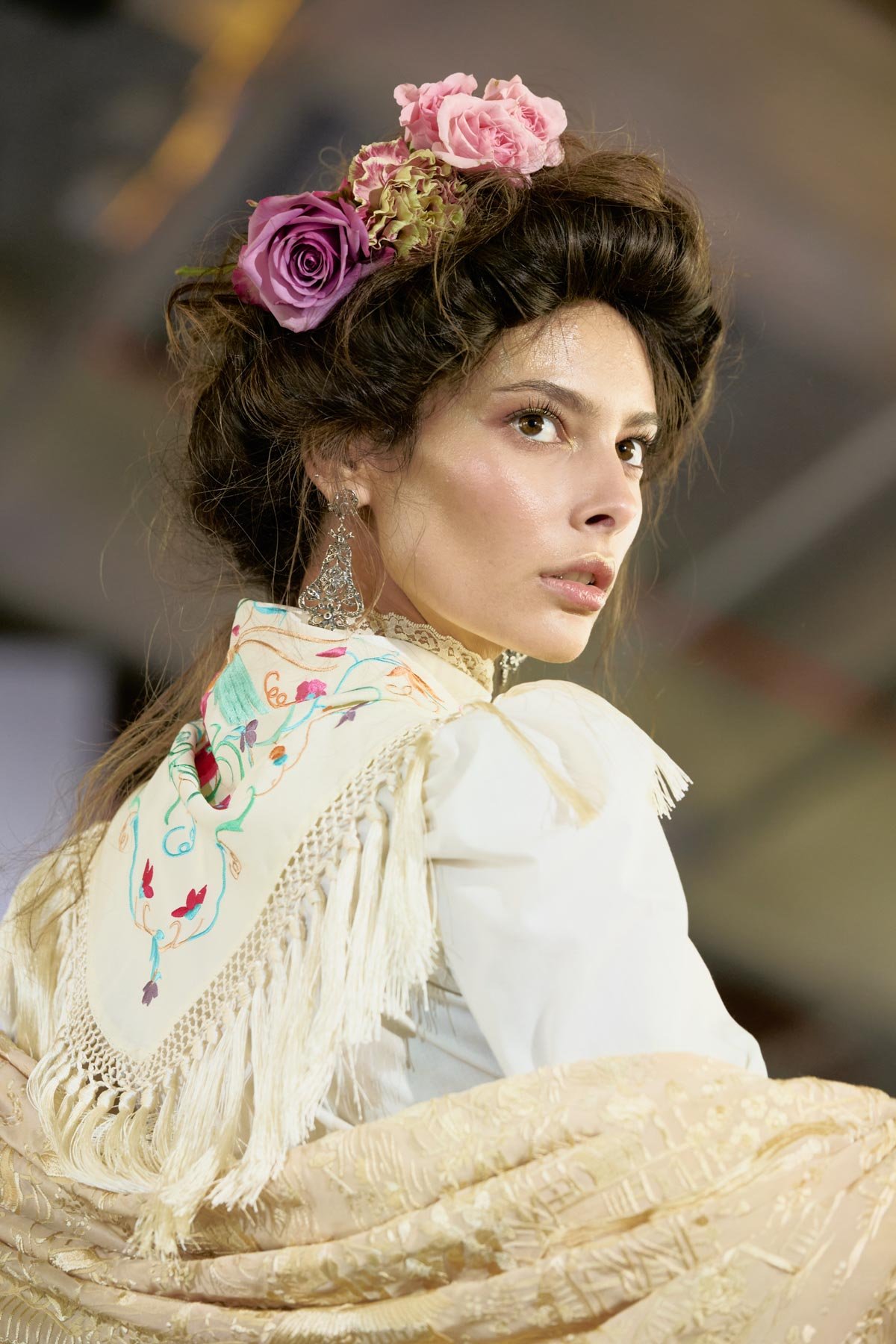 La propuesta se construye a partir de una paleta cromática rica donde predominan el negro, el azafrán, el añil, el verde musgo, el esmeralda o el azul cerúleo. Colores que cobran vida en tejidos como el algodón, el tul, la gasa o la seda rústica y en elementos clásicos del traje de flamenca, como los lunares oversize, los bordados florales y las rayas.