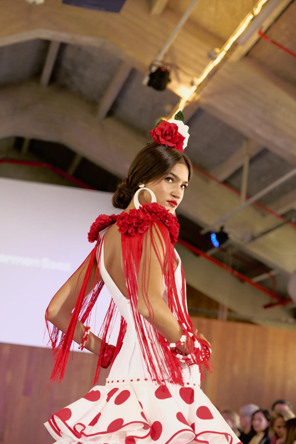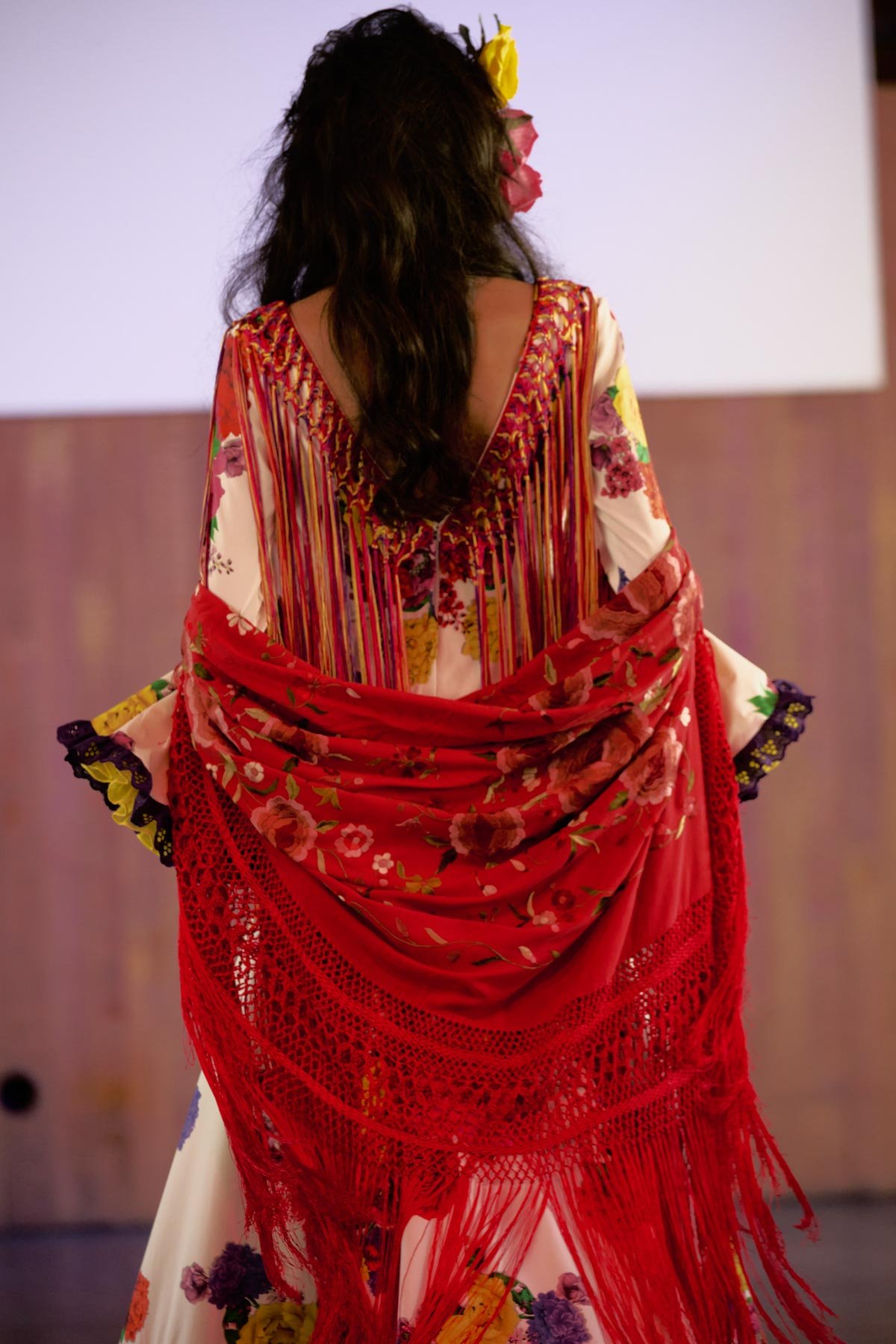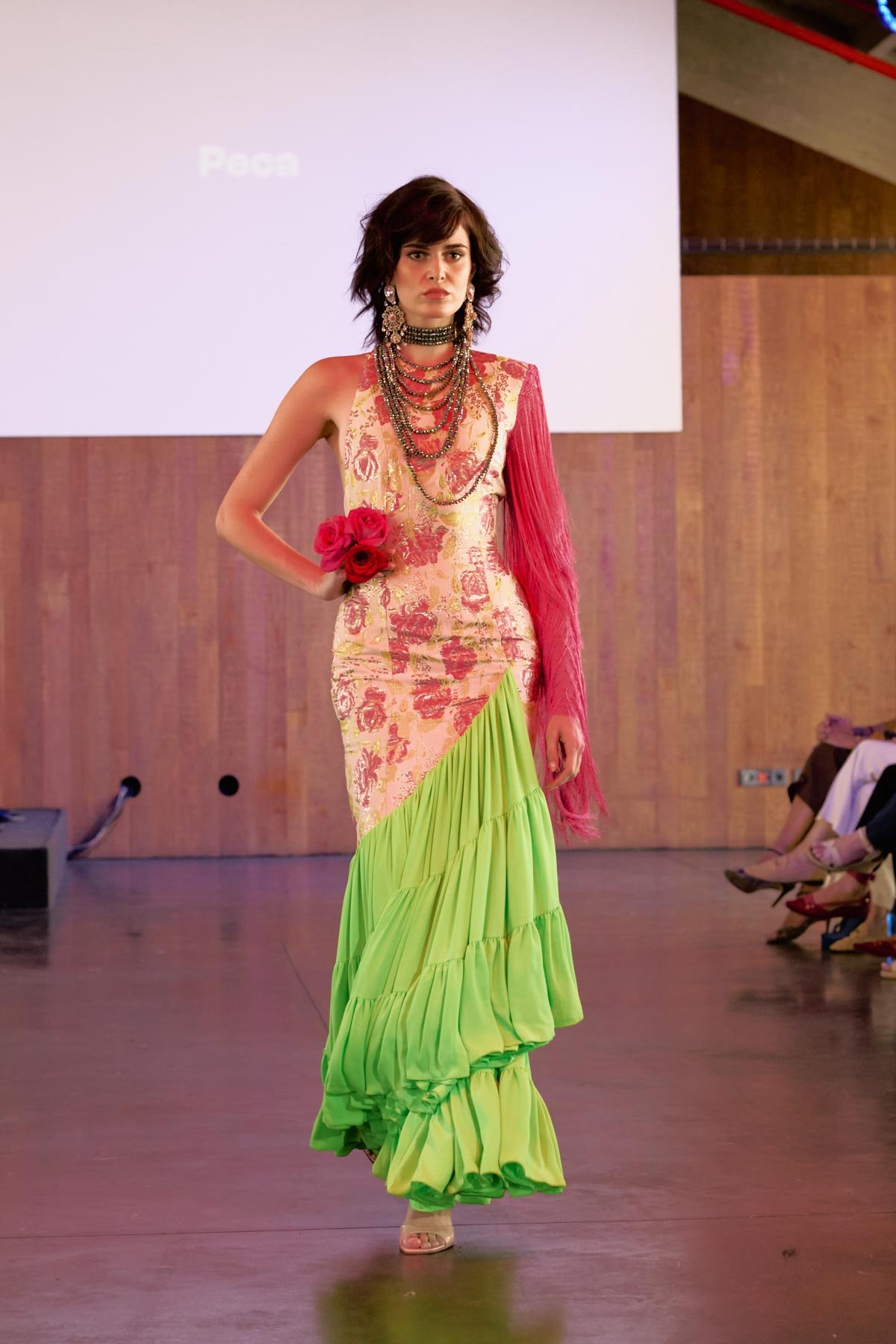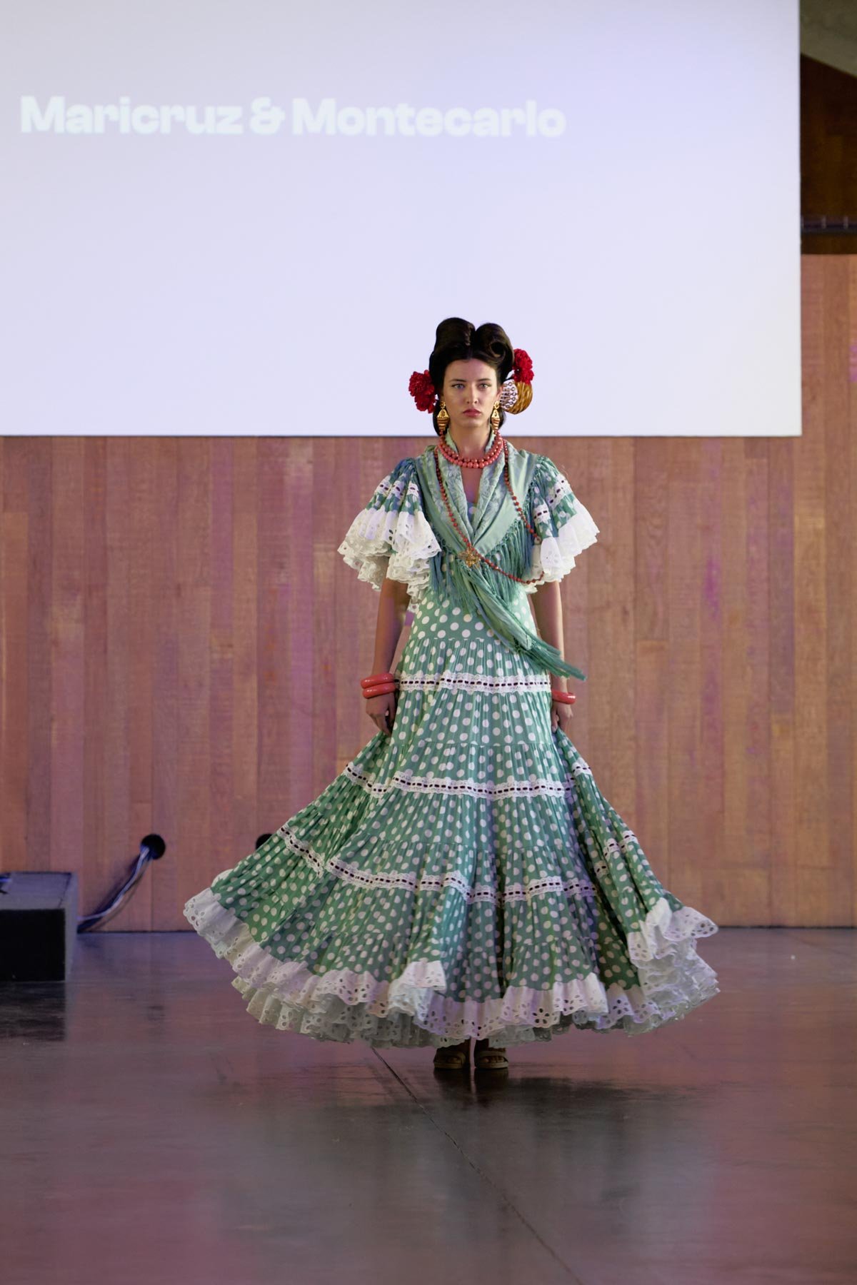 La propuesta se construye a partir de una paleta cromática rica donde predominan el negro, el azafrán, el añil, el verde musgo, el esmeralda o el azul cerúleo. Colores que cobran vida en tejidos como el algodón, el tul, la gasa o la seda rústica y en elementos clásicos del traje de flamenca, como los lunares oversize, los bordados florales y las rayas.