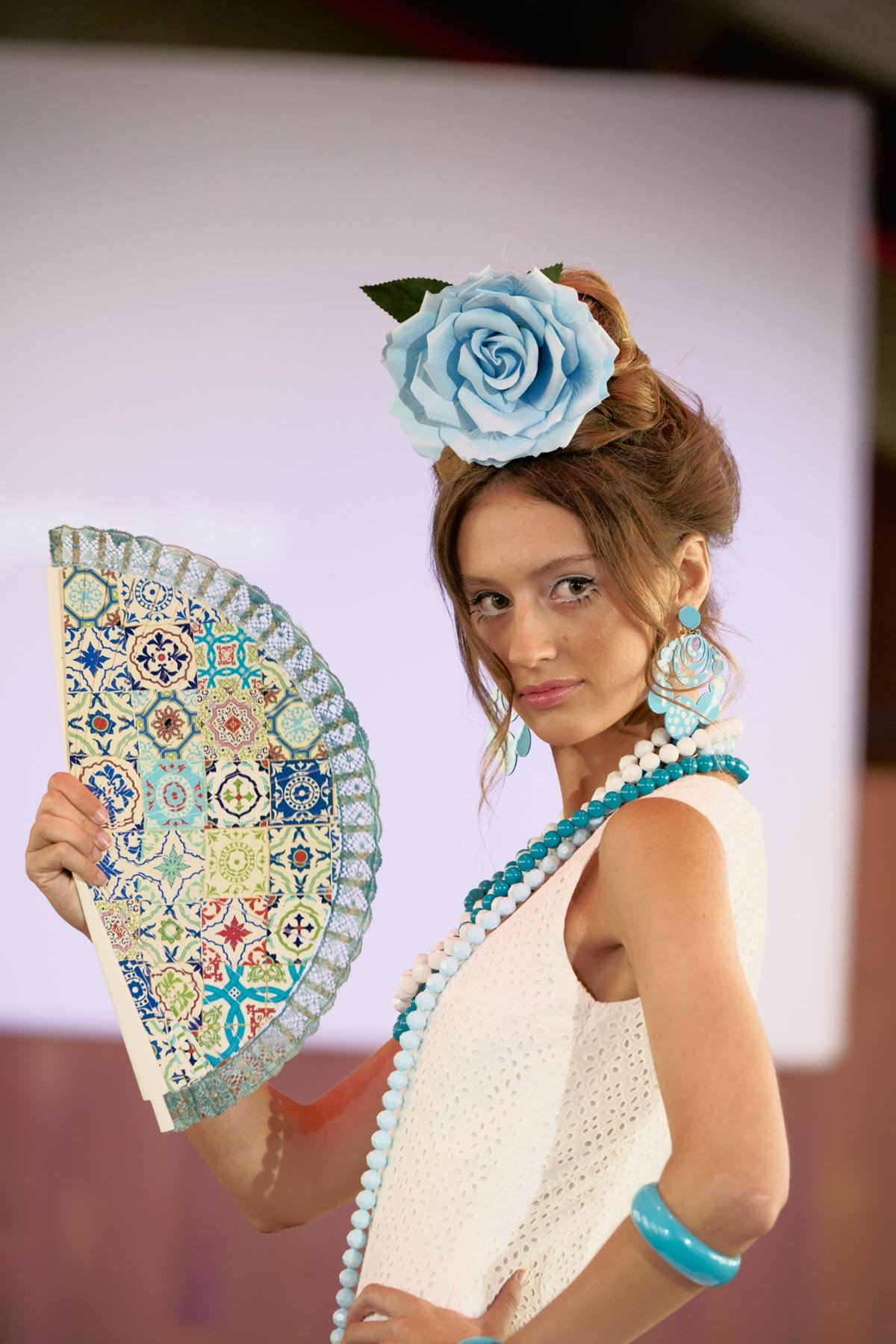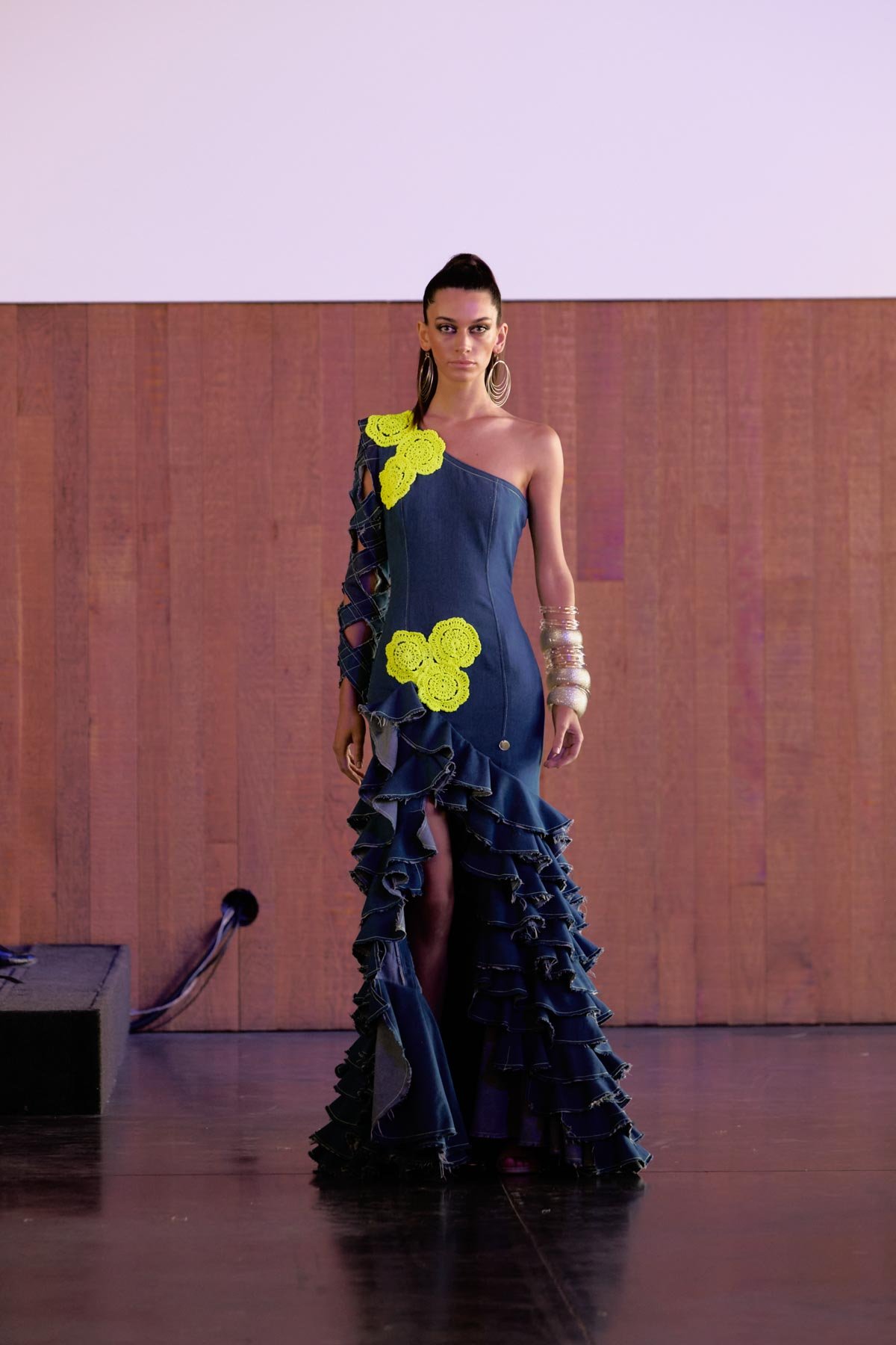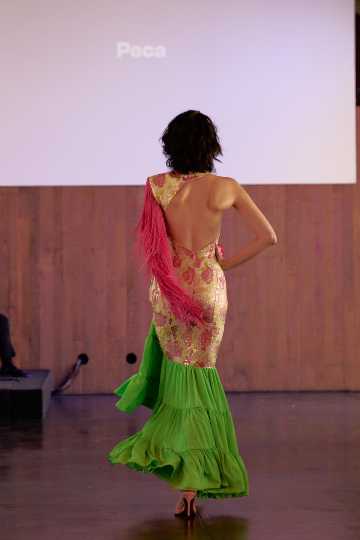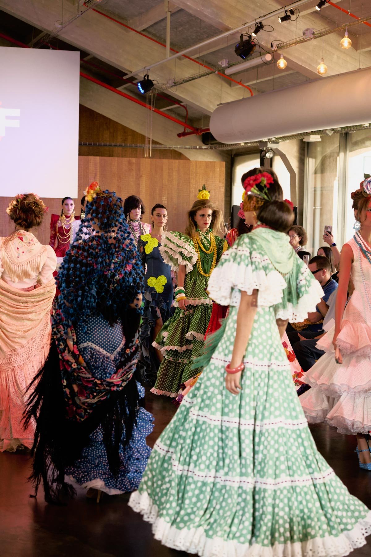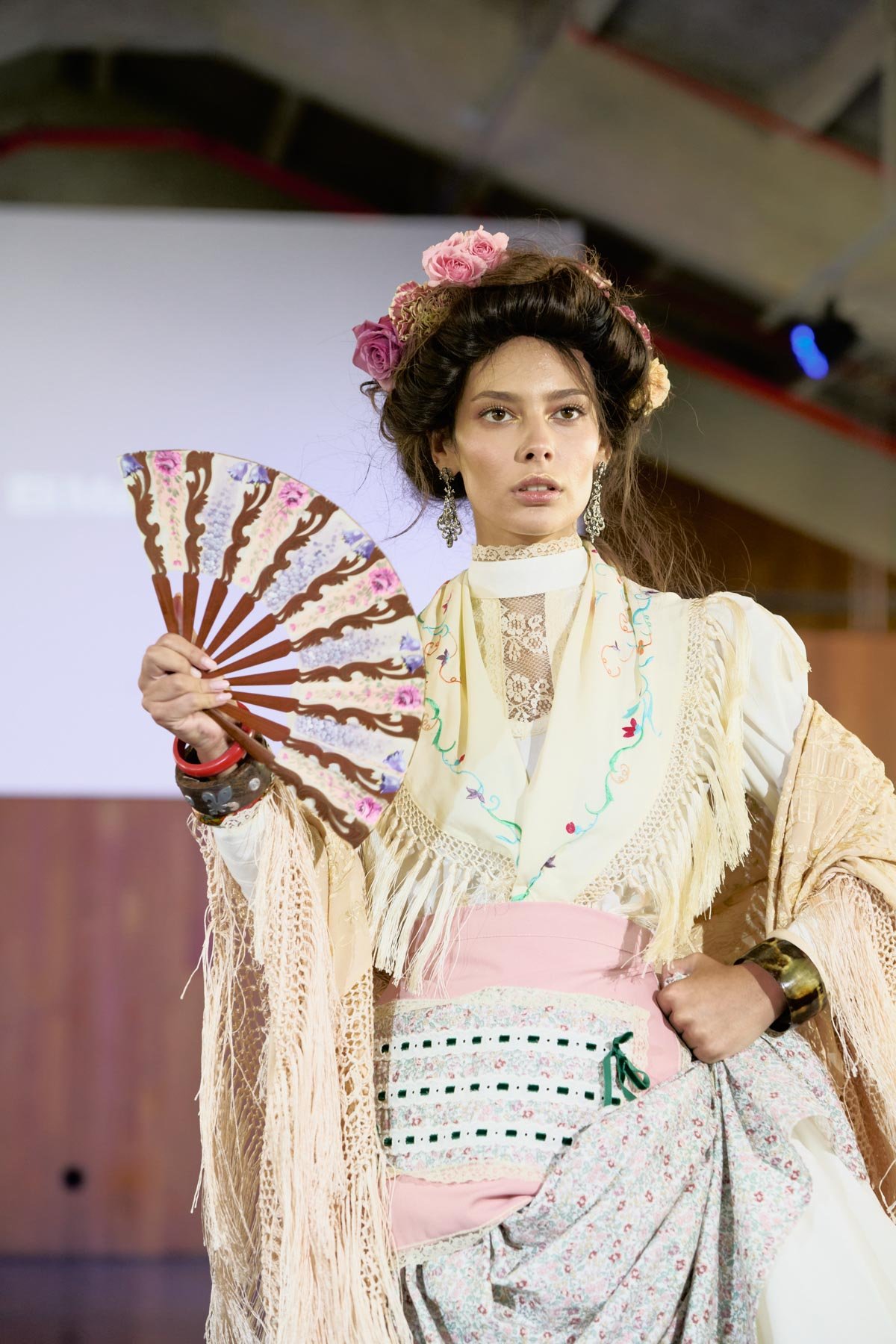 La propuesta se construye a partir de una paleta cromática rica donde predominan el negro, el azafrán, el añil, el verde musgo, el esmeralda o el azul cerúleo. Colores que cobran vida en tejidos como el algodón, el tul, la gasa o la seda rústica y en elementos clásicos del traje de flamenca, como los lunares oversize, los bordados florales y las rayas.