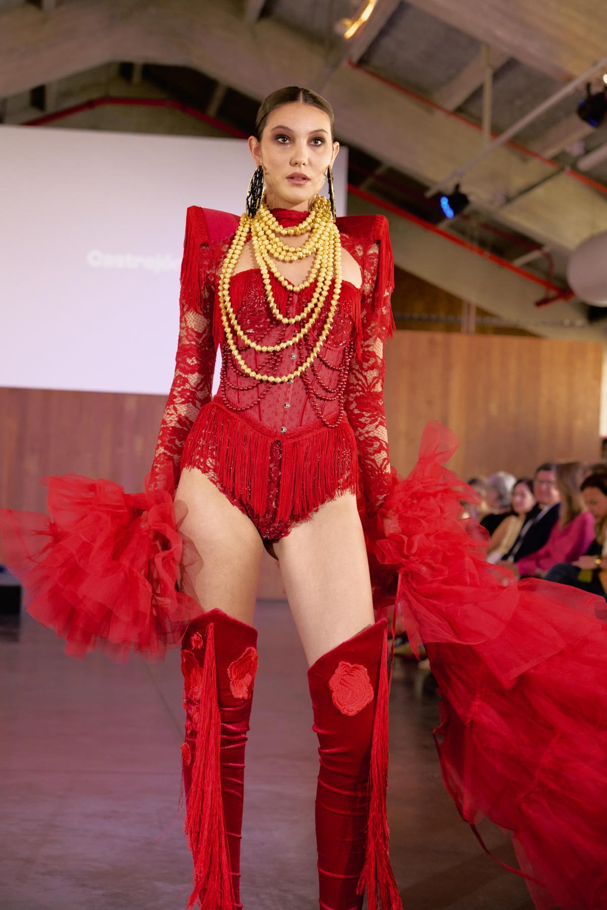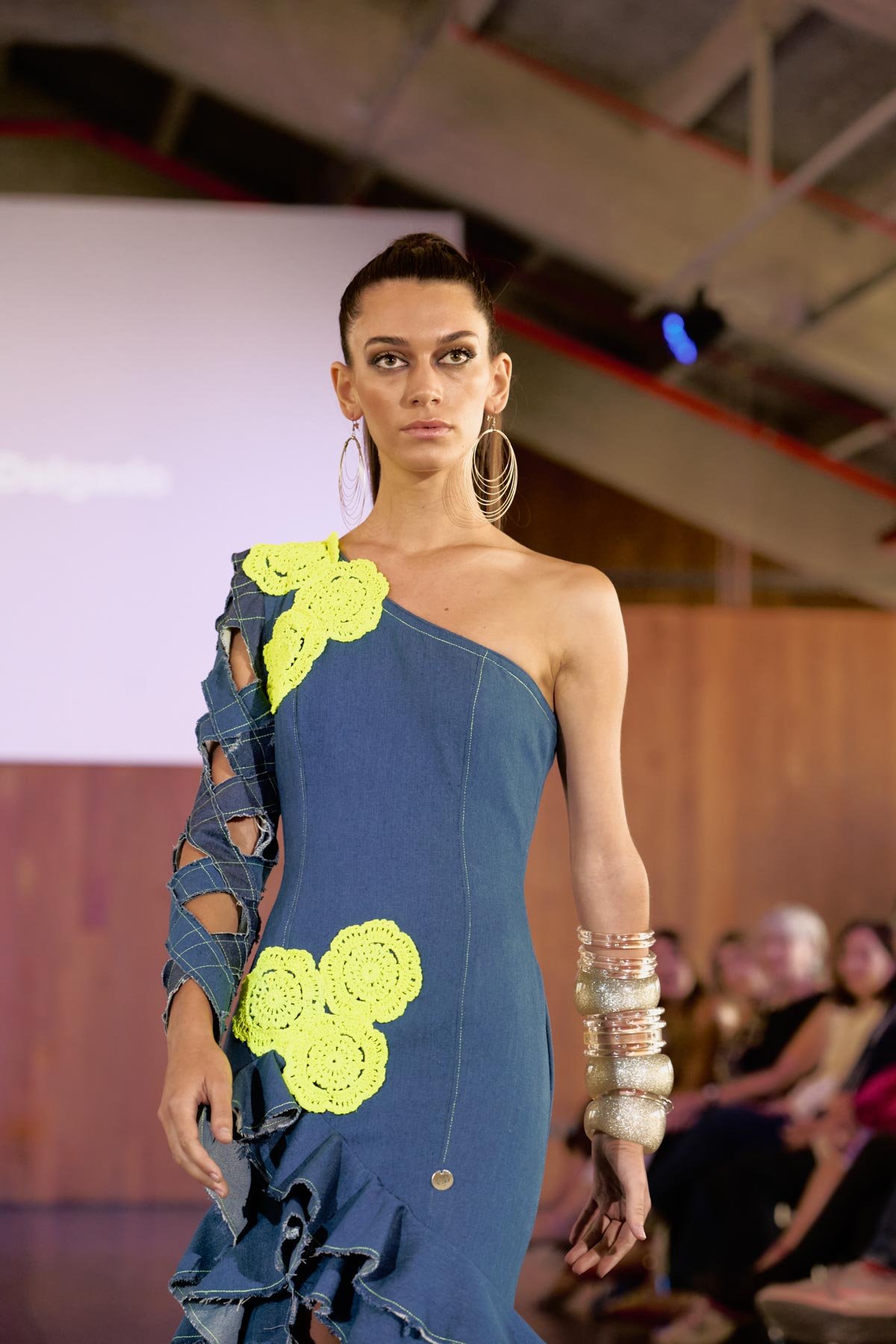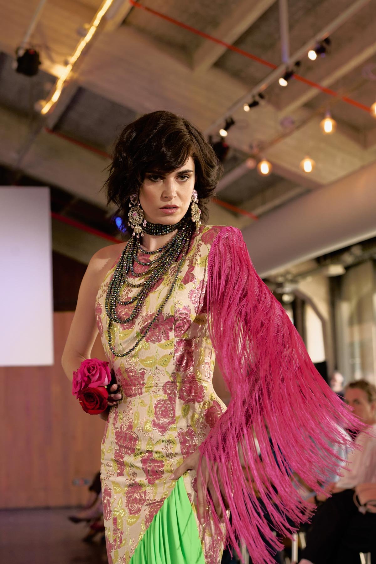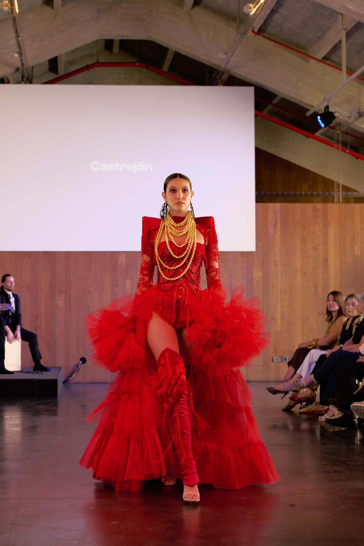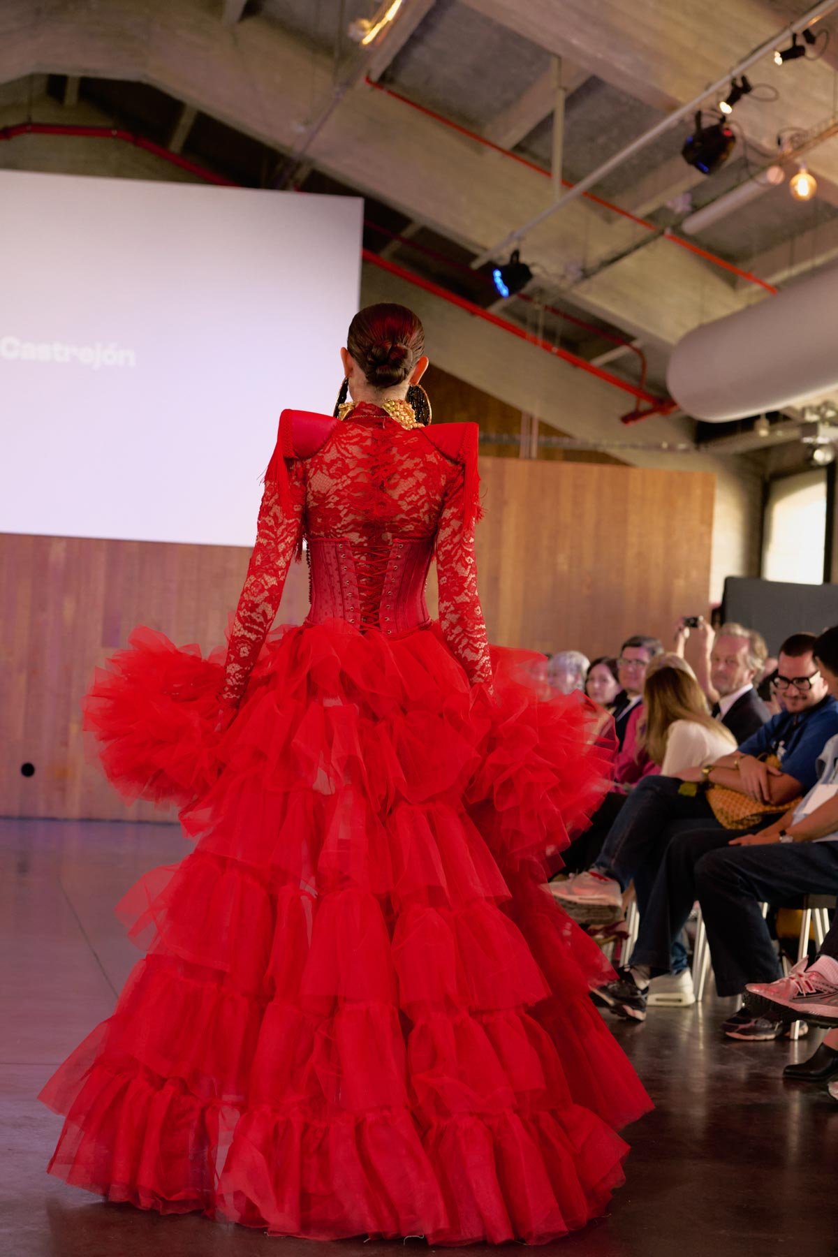 La propuesta se construye a partir de una paleta cromática rica donde predominan el negro, el azafrán, el añil, el verde musgo, el esmeralda o el azul cerúleo. Colores que cobran vida en tejidos como el algodón, el tul, la gasa o la seda rústica y en elementos clásicos del traje de flamenca, como los lunares oversize, los bordados florales y las rayas.