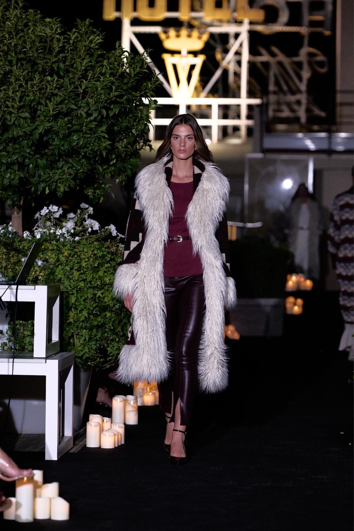 “Symphony” es una colección que fusiona siluetas estructuradas con tejidos nobles como la alpaca, el terciopelo, el pelo vegano, las flores devoré, los cuadros y la lana. La paleta cromática de la propuesta transita por tonos tierra, teja, granate, crudos, negro, azul marino y rosa empolvado, con acentos en verde militar y rojo profundo.